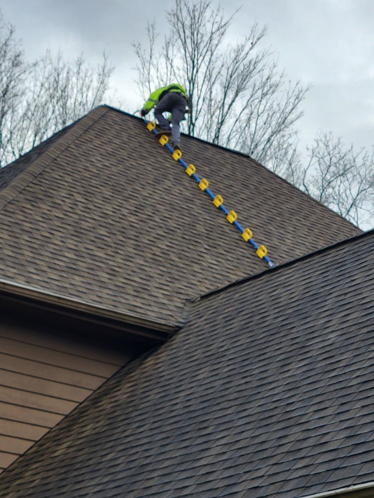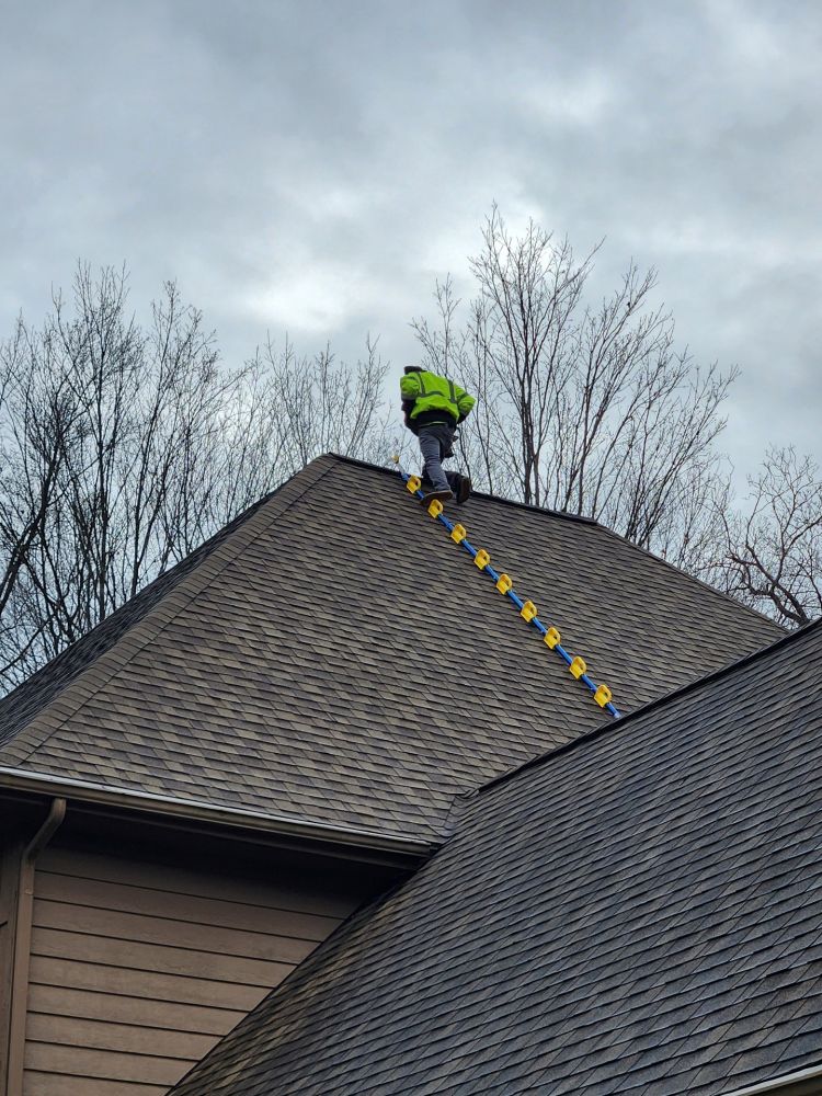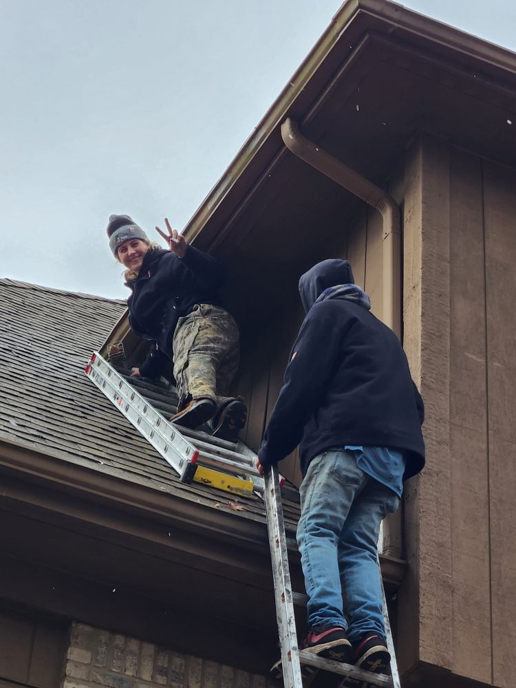 漂亮女子这边工作着, 那边另一个小伙子已经爬到了房顶, 我们家的房顶斜度大,所谓的难度系数人家是1的话, 我们家的得是1.5,所以在房顶无论做什么工作都比一般的房子付的工钱要多。