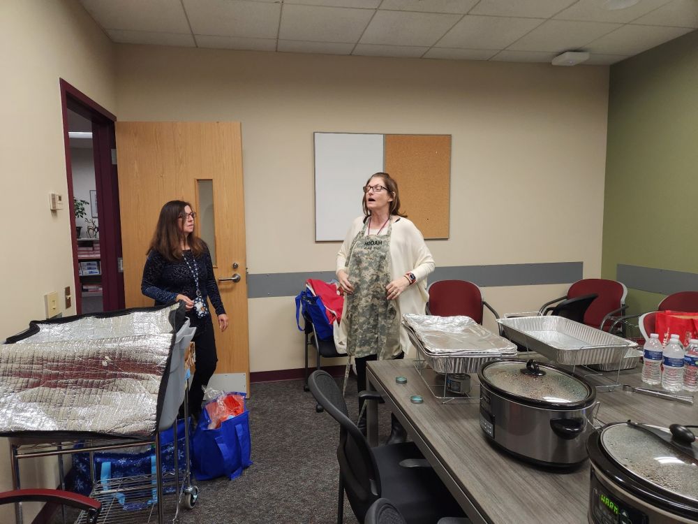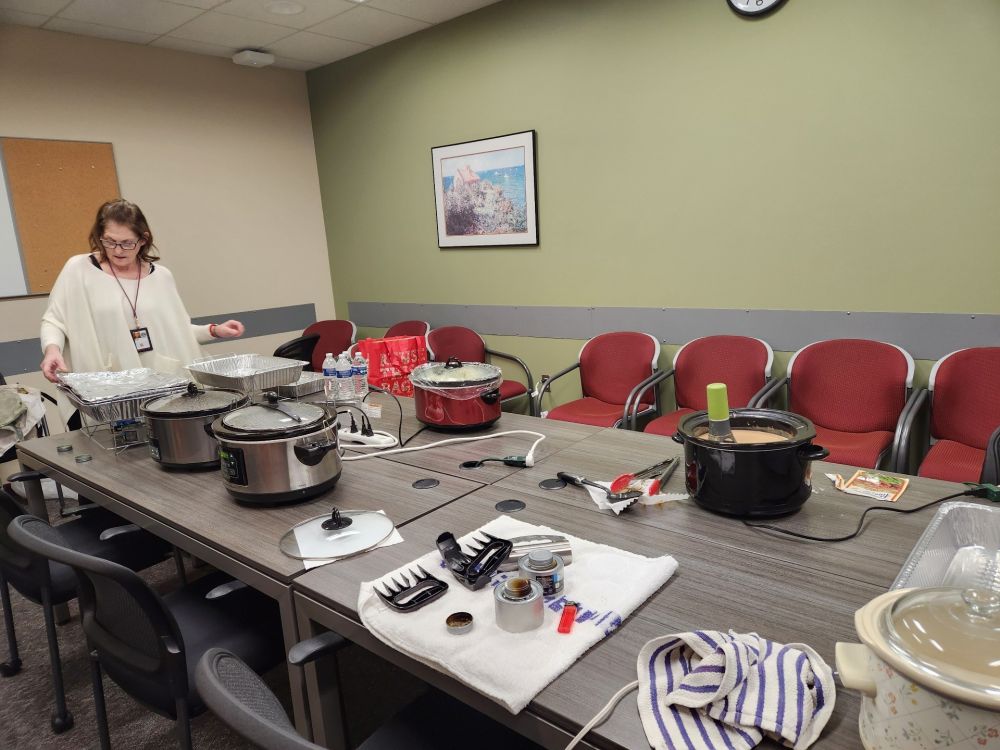 抱着一大锅米饭走进平时开会、今天当做厨房的小会议室, Karen和一群美国行政大妈们已经系着围裙在干活了。