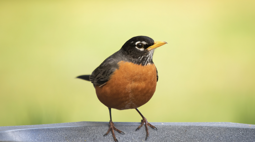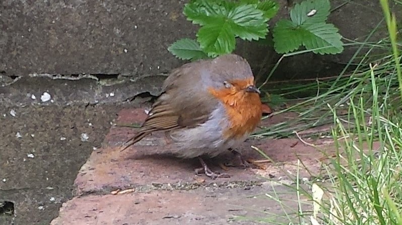 Robin 鸟比一般的麻雀大许多, 又比鸽子小一些, 在我们这里常见的robin 胸部都是黄黄的毛, 羽毛大都是灰色的, 长相不出众, 但也不难看。我们家后院里的各色鸟儿比他漂亮得多了去了, robin 鸟儿就一普通鸟儿, 但我喜欢这鸟儿, 因为他们经常吃草地里的虫子,帮我除害。
