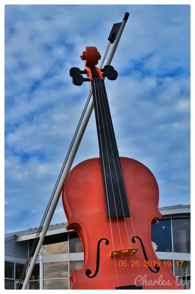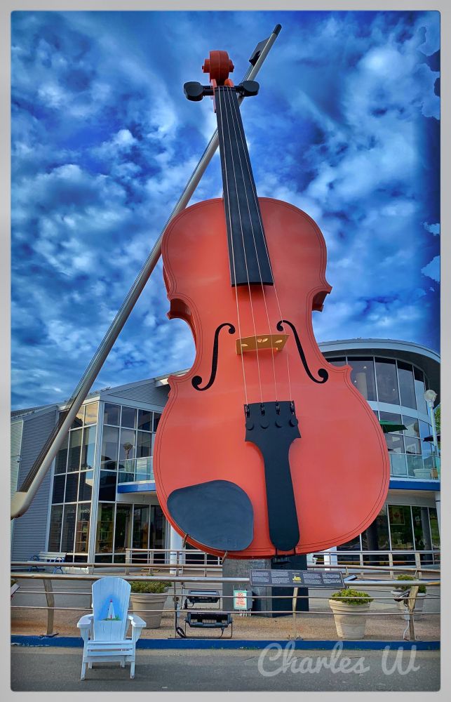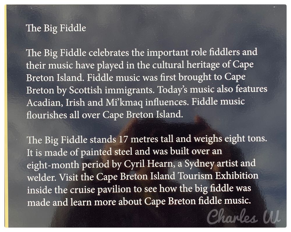 先参观悉尼港边世界最大的小提琴,新斯科舍省悉尼市居住了很多爱尔兰人以及苏格兰凯尔特人的后裔,除了盖尔语音乐,凯尔特人的音乐文化在这里十分流行,该小提琴是专门为了一年一度的凯尔特人节而建,据说在起重机的协调下, 这么大的小提琴依然可以演奏出美幻的音乐。