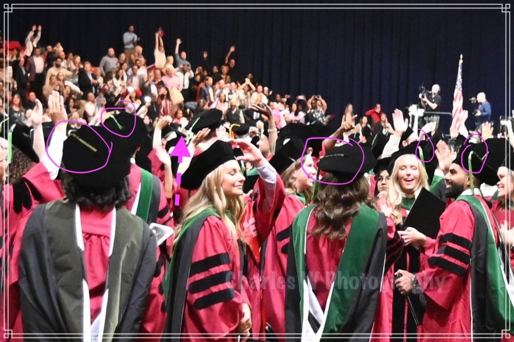 6. 流苏翻转( tassel-turning ceremony): 毕业生最初佩戴毕业帽时,流苏位于右边。通常在典礼接近尾声时,在学位正式授予后,主持人(如院长或大学校长)会说类似“请毕业生将流苏从右边移到左边” 的话,表明毕业生已正式获得学位。对于MD毕业生来说,流苏翻转是一个充满自豪和成就感的时刻,标志着多年严格医学培训的圆满完成以及他们进入医疗职业的准备。这是一个将毕业班团结在一起的共享仪式。