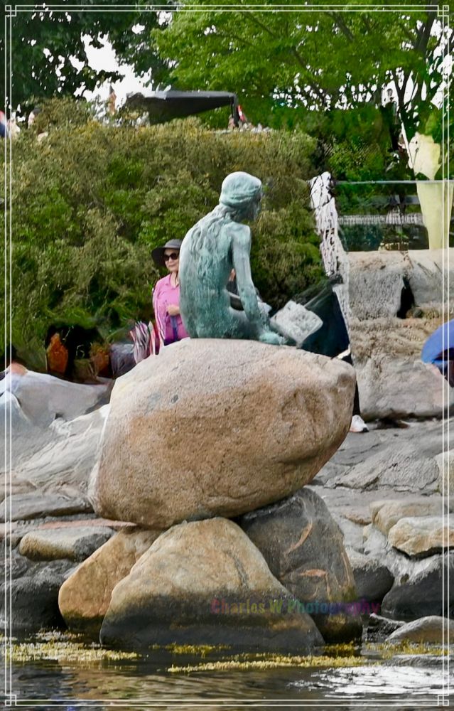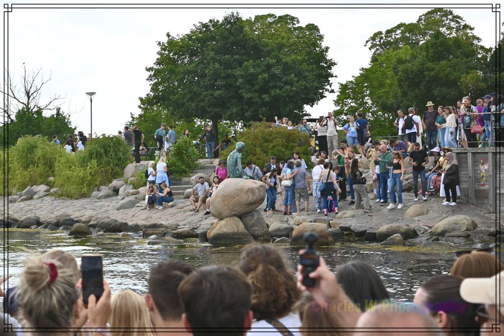 当游轮驶向海边,导游提醒道:“接下来是小美人鱼雕像,大家准备好拍照!”小美人鱼(The Little Mermaid)的背影出现在视野中,她静静地坐在岩石上,凝望远方。虽然雕像比想象中要小得多,但那种孤独而诗意的气质让人动容。阳光在她青铜色的身体上闪耀,海浪轻轻拍打着岩石,从水面望去,她比照片上更孤单,青铜的身影静静凝望着远方的海口,仿佛依旧在等待属于自己的波浪。我忍不住按下快门,试图捕捉这一刻的永恒。导游补充道:“她是安徒生童话的象征,也是哥本哈根的文化名片。”