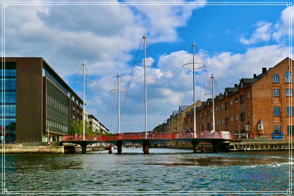 游轮转向一处独特的建筑,导游兴奋地说:“这是Circle Bridge (圆桥),由艺术家Olafur Eliasson设计的!”这座五个圆环相连的步行桥横跨运河,简洁而现代的设计让人眼前一亮。桥上行人悠闲地散步,有人驻足拍照,导游笑着说:“这座桥不仅是交通工具,还是一件艺术品!”