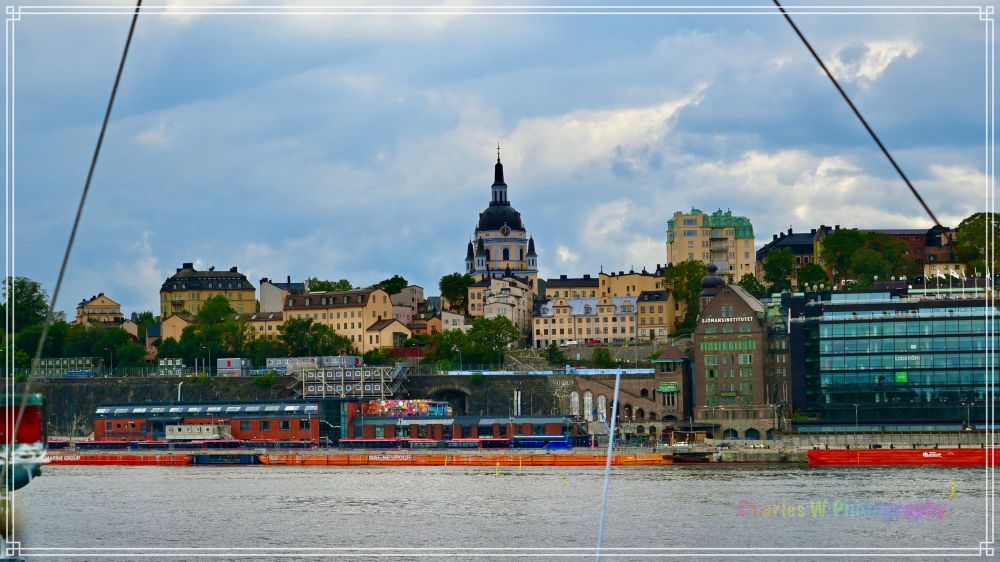 在船上,可以望见远远的蓝顶及旁边的建筑,是斯德哥尔摩的新教堂(Nya kyrkan),它也常被称为谢普斯霍尔门教堂(Skeppsholmskyrkan)。这座教堂建于1842年,由建筑师弗雷德里克·布洛姆(Fredrik Blom)设计,风格为新古典主义。它位于谢普斯霍尔门岛(Skeppsholmen),旁边停靠着一艘名为“af Chapman”的大型帆船,现在是一座青年旅舍。