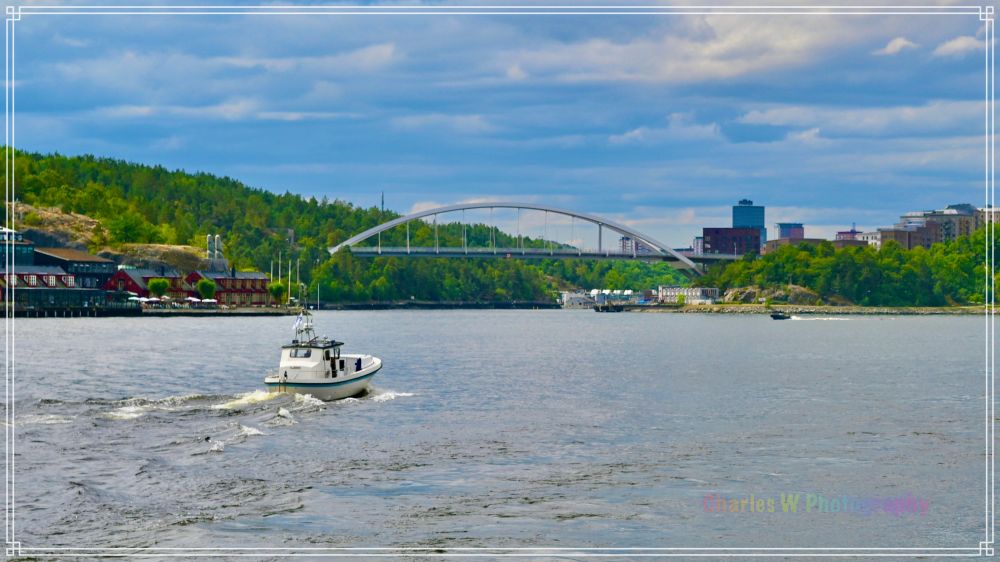 这拱形桥是 Essingeleden高速公路的一部分桥段(可能是Tranebergsbron 或 Lilla Essingebron附近的桥梁),因为游船多从斯德哥尔摩市区驶出进入马拉伦湖水道时,会经过这里。