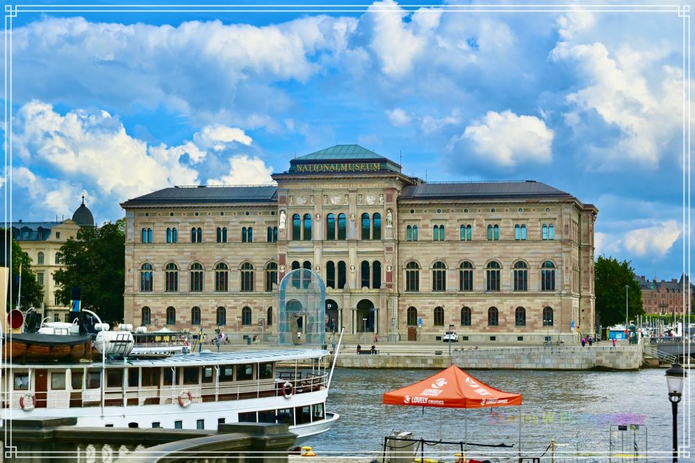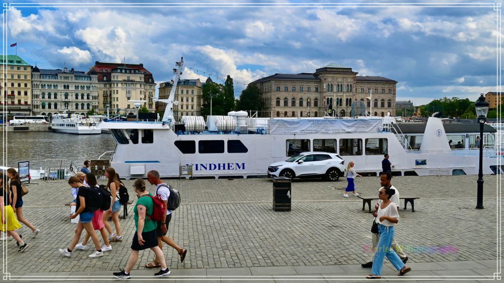 盛夏的斯德哥尔摩毕竟是北欧,风和日丽,云卷云舒。阳光透过层叠的云隙,映在波光粼粼的水面上。我们在国家博物馆(National Museum)对面的码头登上了一艘白色游轮Vindhem号,甲板上游客们三三两两,有的迫不及待举着相机,捕光捉影,有的慢悠悠地喝着咖啡,悠然自得。随着一声低沉的汽笛,游轮缓缓离岸,驶入这座“北方威尼斯”的水上世界。