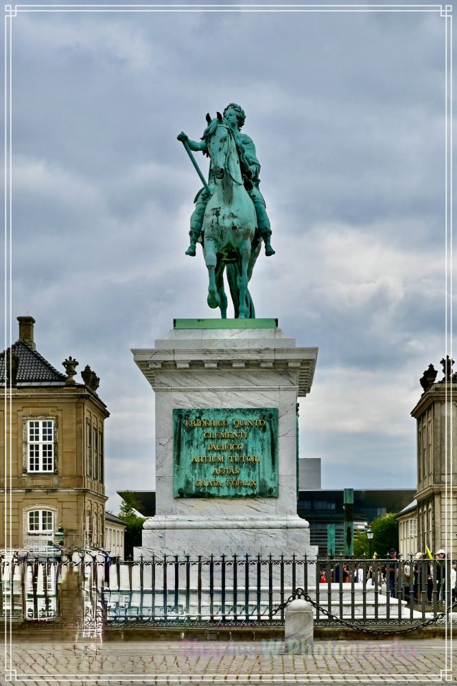 广场中央矗立着弗雷德里克五世的骑马铜像,他是这座宫殿的建造者。