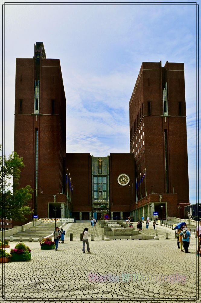我们的下一站是奥斯陆市政厅,这座红砖建筑以其庄严而朴实的风貌成为城市的地标。市政厅建于1931至1950年间,所以顶上挂有75字样,纪念市政厅75周年。其设计融合了挪威传统与现代主义风格,外墙的红色砖块与两座高耸的塔楼相得益彰。市政厅就坐落在奥斯陆峡湾的岸上。