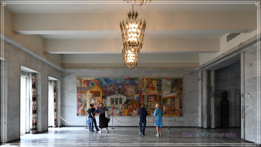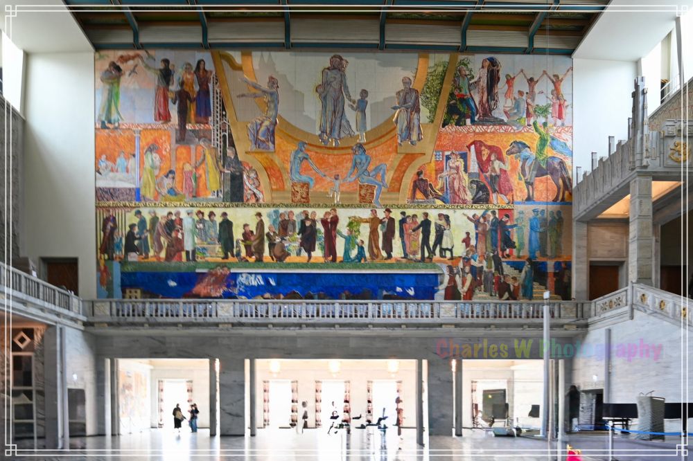 步入大厅, 我们被宏伟的壁画震撼:这些色彩浓烈的壁画由多位挪威艺术家创作,主题涵盖挪威的历史、文化与人民生活,从渔业到工业,从战争到和平,细腻地展现了这个国家的精神脉络。