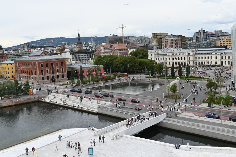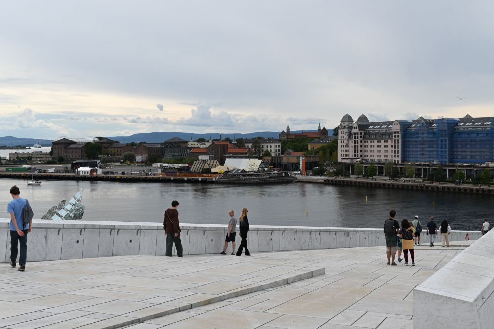 游客、学生、当地居民三三两两,或散步,或坐在斜坡上聊天。站在屋顶上回望,奥斯陆市区的红色屋顶与现代高楼交错在一起;向前眺望,则是碧蓝的峡湾与远方的山影,海天一色,令人心旷神怡。