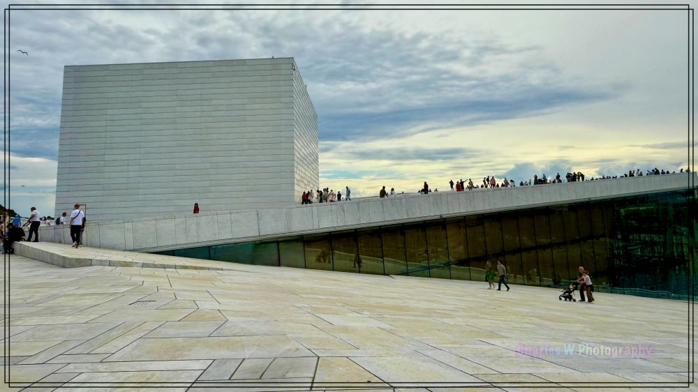 歌剧院最奇妙之处,是它那倾斜的屋顶。白色的花岗岩从地面一路斜坡延平缓地伸向上到顶端,游客可以自由走上屋顶,俯瞰奥斯陆港、城市与周围山景,好像游客可以漫步“冰川屋顶”,所以又称为“可行走的屋顶”。