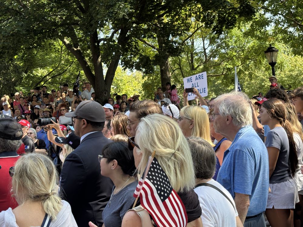自发活动定于中午12点开始,当抵达公园时,已是人山人海, 车停在小镇的室内停车场内。估计有上千人聚集在这里:从当地居民到Turning Point USA(TPUSA)的忠实支持者,甚至有从芝加哥远道而来的年轻人-年轻人真不少。大家手持美国国旗,胸前别着印有Charlie Kirk头像的贴纸,还有人举着“我们都是查理”的标语,空气中弥漫着鲜花、蜡烛和爱国精神的混合气息。公园的草坪上,临时搭建的纪念台前堆满了花束、气球和手写卡片,有人写道:“Charlie,你点燃了我们的斗志,继续前行!” 这些物品原本面临被公园管理区移除的风险,但社区的呼声让它们得以保留至9月21日的正式追悼会。