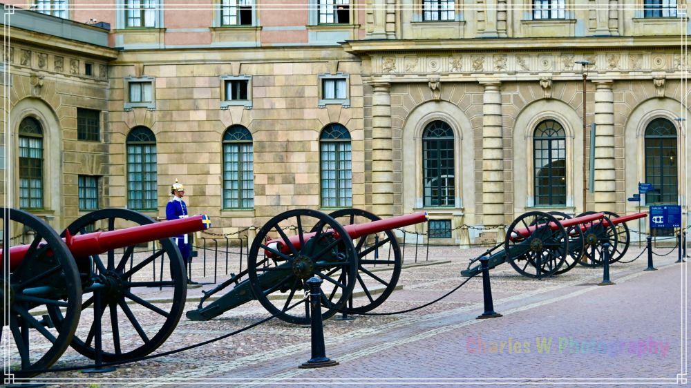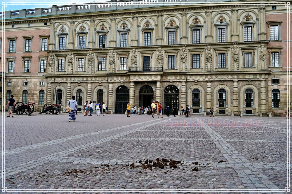 从另外一个门出来,这里是一个四方的皇家庭院, 有几门大炮 ,身着蓝色制服、头戴黑色高帽的瑞典皇家卫兵们在守卫者皇宫。庭院地上还有马的排泄物。