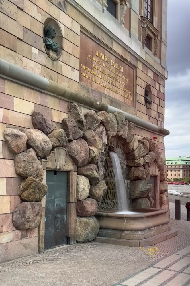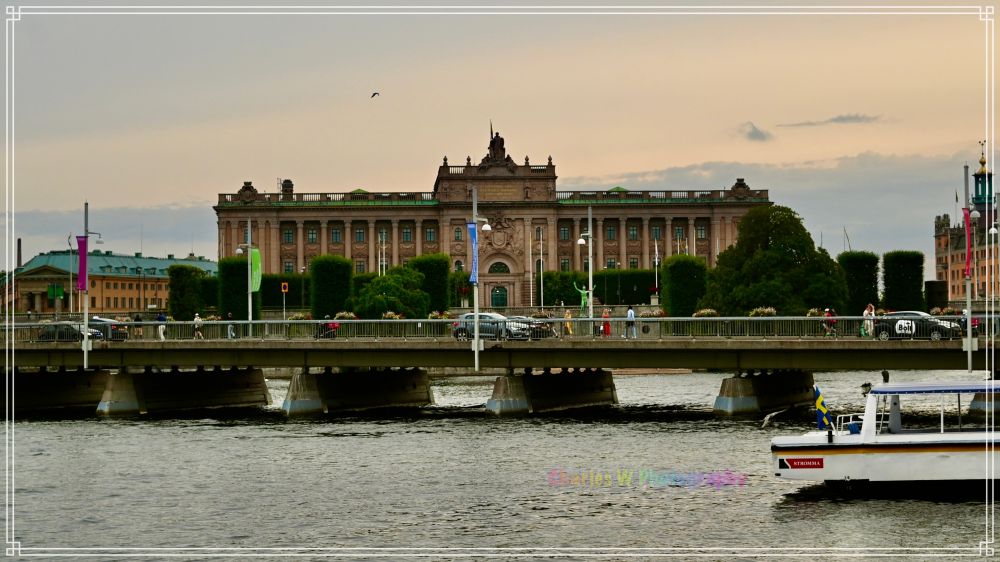 不远处的宏伟建筑是瑞典议会大厦(Riksdagshuset),是瑞典议会(Riksdag)的所在地,横跨斯德哥尔摩老城和市中心之间。照片中前景的这座桥是瑞克斯布朗桥(Riksbron)。许多游客和当地人都会通过这座桥,在国会大厦外拍照,欣赏景色。