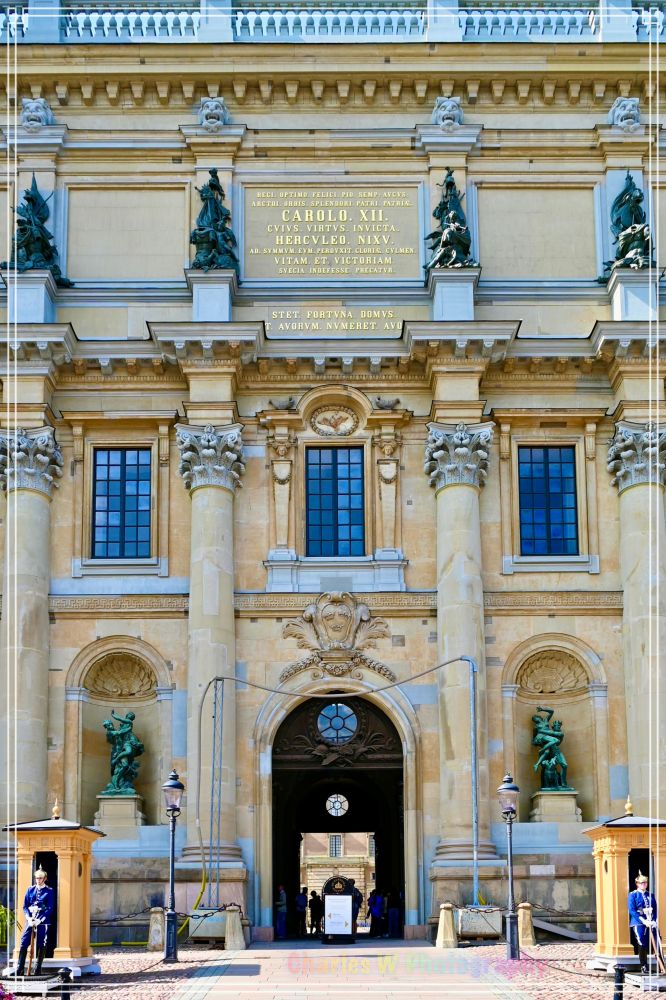皇宫的入口有好几个,我们是从入口之一进入的, 简单的安检后便可入内。门口有瑞典皇家卫兵站岗(橙黄色岗亭),高大的拱门上方墙面有拉丁文铭文,纪念瑞典国王卡尔十二世(Karl XII),门洞两侧壁龛里有青铜雕像,表现的是古代武士或神话人物。