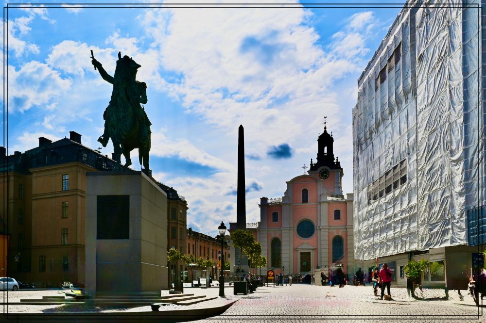 而上面照片中前景的雕塑是古斯塔夫·瓦萨(Gustav Vasa)的骑马雕像,他是瑞典的开国国王。