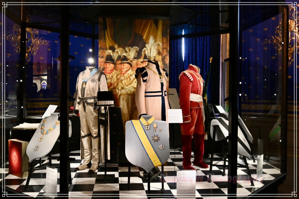 皇宫(Kungliga slottet)里的“Livrustkammaren 皇家军械库博物馆”王室最古老的博物馆,收藏了历代国王和王后的御用服饰、盔甲、加冕礼服、徽章、马车等珍贵实物。照片中展示的就是 王室礼仪服装与勋章:左边是镶有王室徽章的白色礼服和佩剑;中间浅色和红色的制服是国王或王子在加冕典礼、重要仪式中穿着的服饰;前景的展台上可以看到 瑞典王室的绶带和勋章(黄色蓝色的绶带是瑞典国王的重要标志之一)。背景墙上的画也表现了瑞典宫廷盛大的加冕或典礼场景。