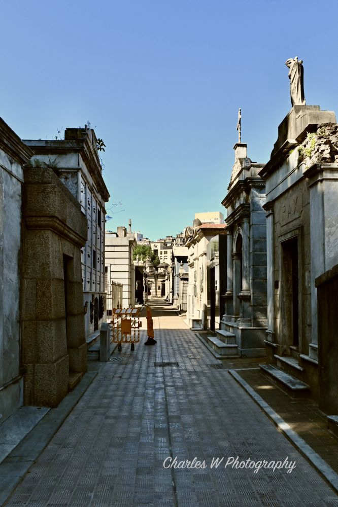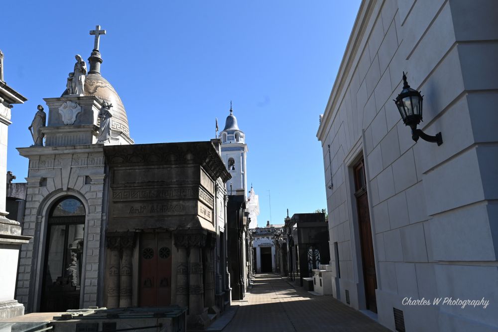 与传统墓园不同,雷科莱塔采用类似我们城市街区的布局, 即是死去人的城市社区, 但像活人一样生活, 有街道,有门牌号码,还有教堂,个人墓地是一座小型的房屋,有门有窗。笔直的墓道如同街道,两侧排列着规模宏大的家族陵墓。建筑风格从新古典主义到哥特式、装饰艺术风格不一而足,大理石、青铜与雕塑在阳光下交错呈现,使这里更像一座关于死亡与记忆的艺术空间。也正因如此,雷科莱塔公墓常被称为“世界上最美的公墓之一”,成为像我们这样游客与历史爱好者必到的地方。