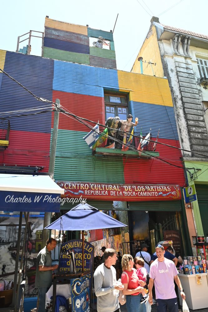 午后,我们转向南方,来到La Boca的彩色街区,尤其是卡米尼托(Caminito)。这个工人阶层社区曾是意大利移民的聚居地,他们用船上剩的油漆涂刷简陋的铁皮屋,造就了今日五彩斑斓的街景。狭窄小巷中,涂鸦墙、艺术工作室和街头探戈表演交织,空气中仿佛回荡着1926年那首著名探戈《Caminito》的旋律——它正是受这条小街启发而作。