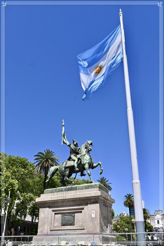 位于广场东侧、玫瑰宫(Casa Rosada,阿根廷总统府)正前方的是一座青铜骑马雕像,是曼努埃尔·贝尔格拉诺将军(General Manuel Belgrano)。雕像建于1873年,由法国雕塑家阿尔伯特-欧内斯特·卡里尔-贝勒斯(Albert-Ernest Carrier-Belleuse)和阿根廷雕塑家曼努埃尔·德·圣塔科洛马(Manuel de Santa Coloma)合作创作。贝尔格拉诺将军手持阿根廷国旗(他正是国旗的设计者),是阿根廷独立战争的关键人物之一,被誉为五月革命领导者和国家英雄。这座雕像已成为五月广场的标志性地标,与中央的五月金字塔(Pirámide de Mayo)一同见证阿根廷历史