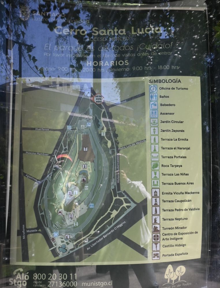 Valdivia 在 1541年12月13 日(圣露西亚日)抵达此地,将 Huelén 更名为 Santa Lucía,圣露西亚是“光明与视力的守护圣人”,象征启蒙与新开始,这呼应了“从此开始建立新城市”的意义。1872年市长 Benjamín Vicuña Mackenna 认为此山是城市中心的瑰宝,发起大规模美化工程包括建造花园、观景台、喷泉,加入欧洲宫廷式的建筑装饰,其中最有名的是美化 Castillo Hidalgo(伊达尔戈城堡)。这让 Santa Lucía 从荒凉的丘陵变成了精致的城市公园。