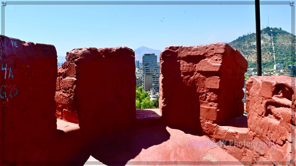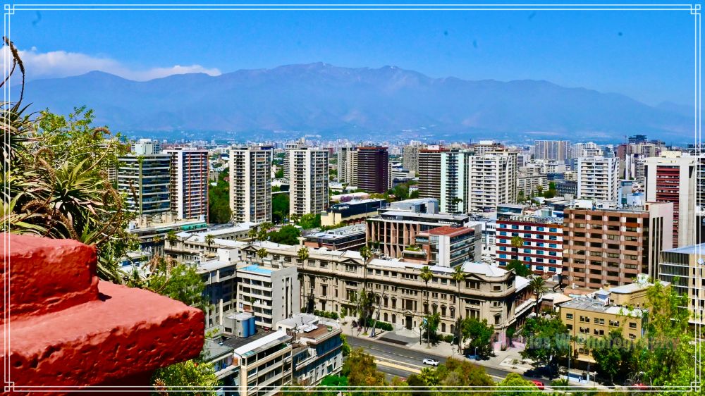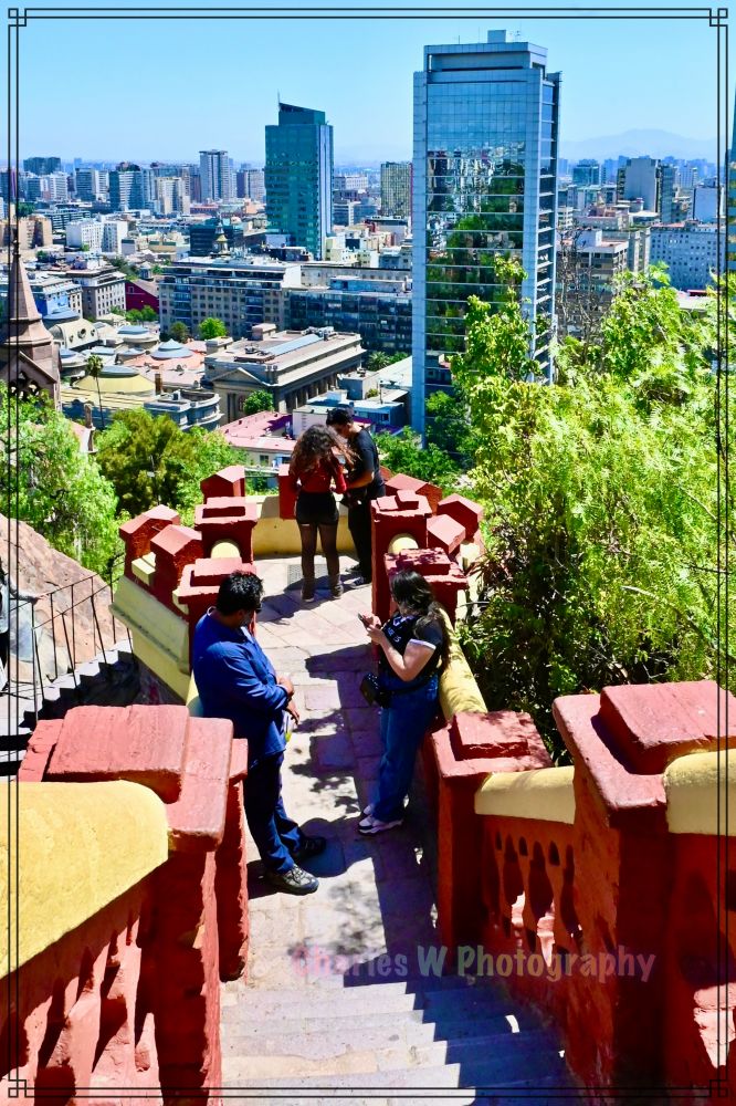 山顶视野开阔,是整个圣地亚哥最经典的景观之一:城市像棋盘一样整齐铺开,南美最高楼 Gran Torre Costanera Center 大楼格外显眼。天空干净,风不大,却能听到微弱呼啸声从山坡吹上来。