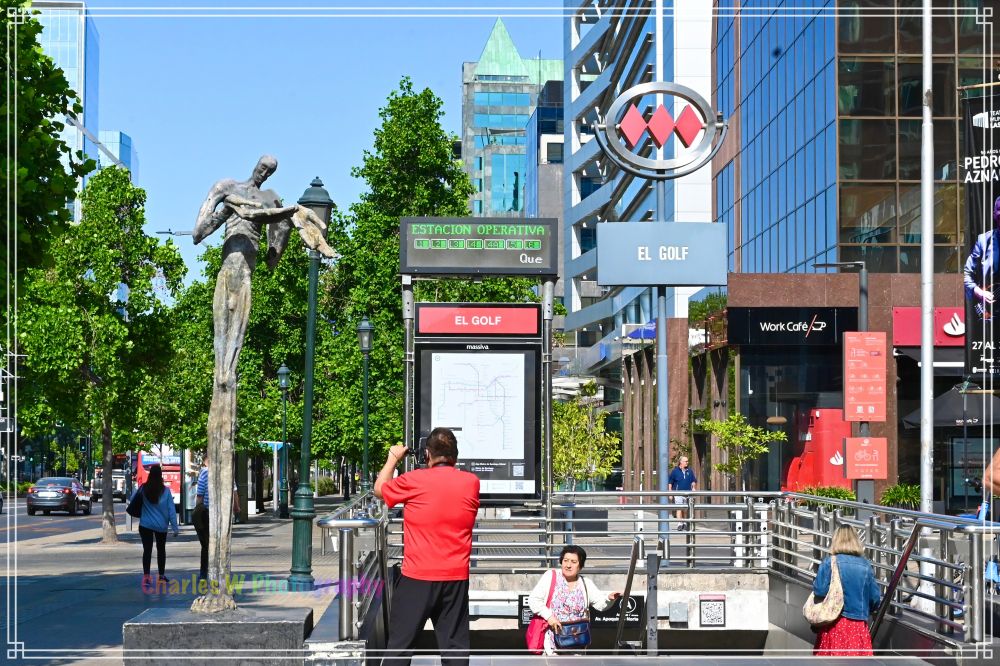坐了四站后出来,旅游车就等在这里,然后带着我们去参观“两百周年公园 (Parque Bicentenario)”。这座公园位于圣地亚哥高档社区维塔库拉(Vitacura),公园是为了庆祝智利独立200周年而开放的,其设计感十分现代。这里没有殖民时代的喷泉。取而代之的是本土的奎莱树和佩乌莫树构成的修长、几何形的线条,以及一片向着金融区摩天大楼延伸的广阔草坪。