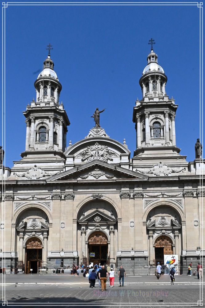 这是北侧的圣地亚哥大都会主教座堂(Catedral Metropolitana de Santiago),融合了新古典主义和巴洛克风格。现存的主教座堂是在同一地点建造的第五座教堂。之前的教堂多次毁于地震和火灾。目前的这座教堂于1748年开始建造,1775年左右落成,其外观在19世纪末期形成。