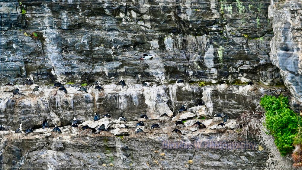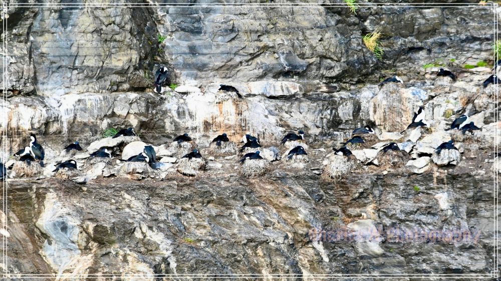航行途中,惊喜不断。我们有幸见到了悬崖上栖息的蓝眼鸬鹚(Blue-eyed Shag)/ 帝王鸬鹚(Imperial Shag) ——在智利通常称为 Imperial Cormorant(Phalacrocorax atriceps)。蓝眼鸬鹚典型特征是头部呈蓝绿色金属光泽,鲜艳的蓝色眼圈(blue eye-ring),身体黑白分明(背部黑、腹部白),多在垂直岩壁上成群筑巢,巴塔哥尼亚是它们的典型栖地,这类鸬鹚在南智利与南阿根廷非常常见,尤其在峡湾、冰川附近。