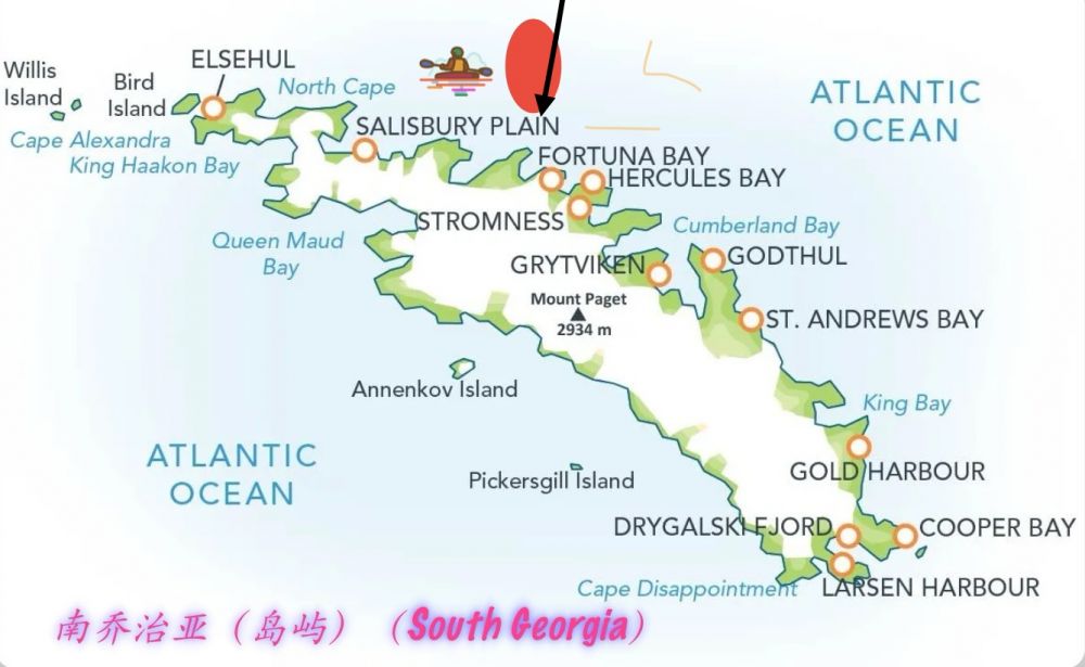 2025年12月27日清晨,游轮在轻微的摇晃中靠近南乔治亚岛东北部的 Salisbury Plain(下图箭头)。此时天空低垂,细雨绵绵,灰白色的云层几乎与海面连成一片,今天的天气不是太好。