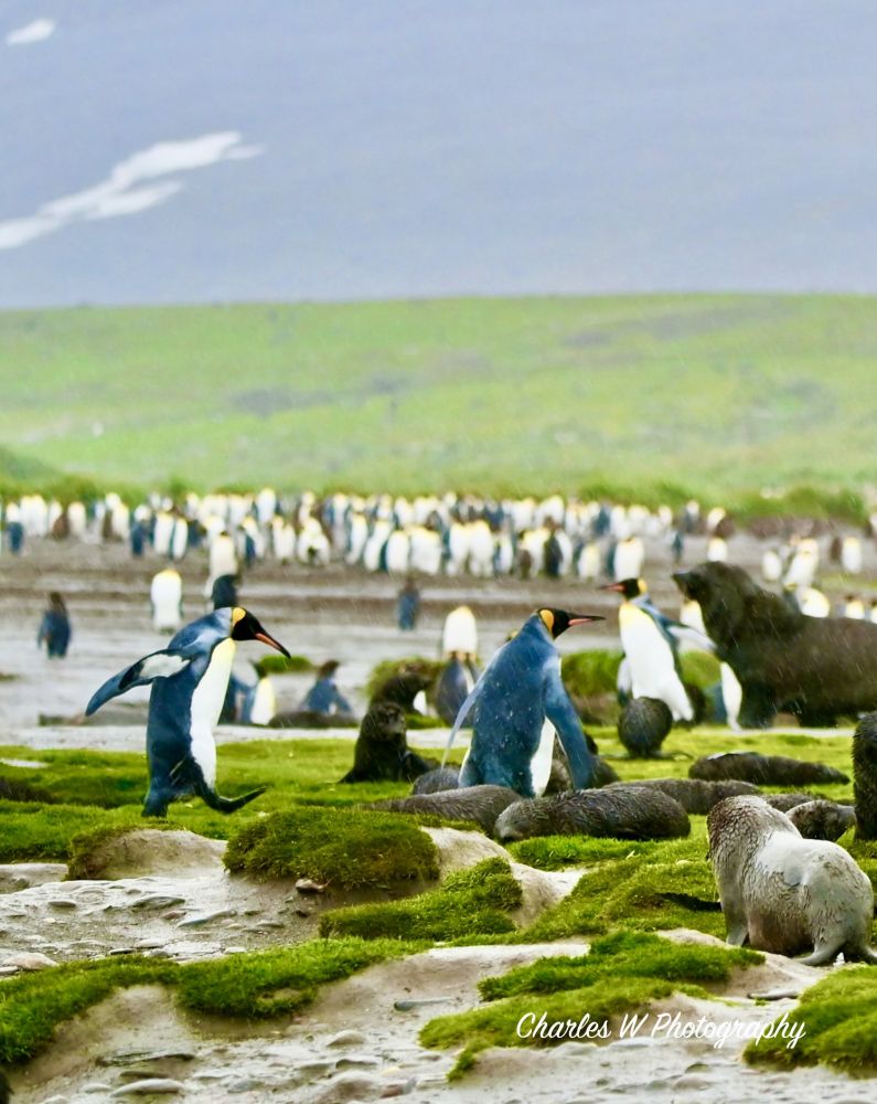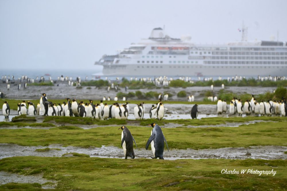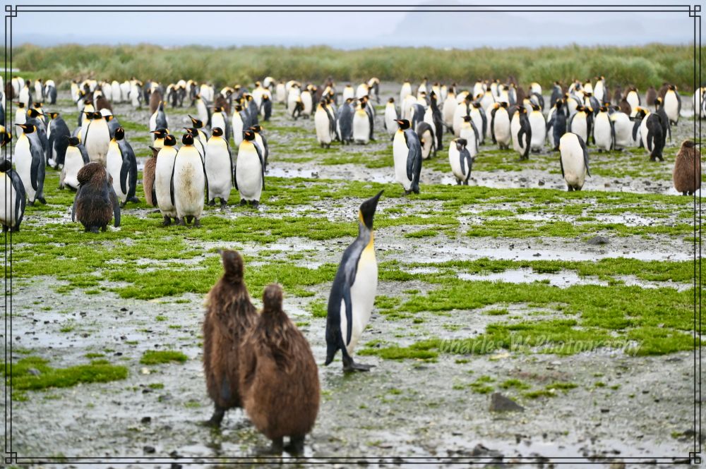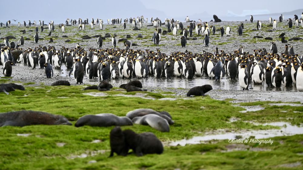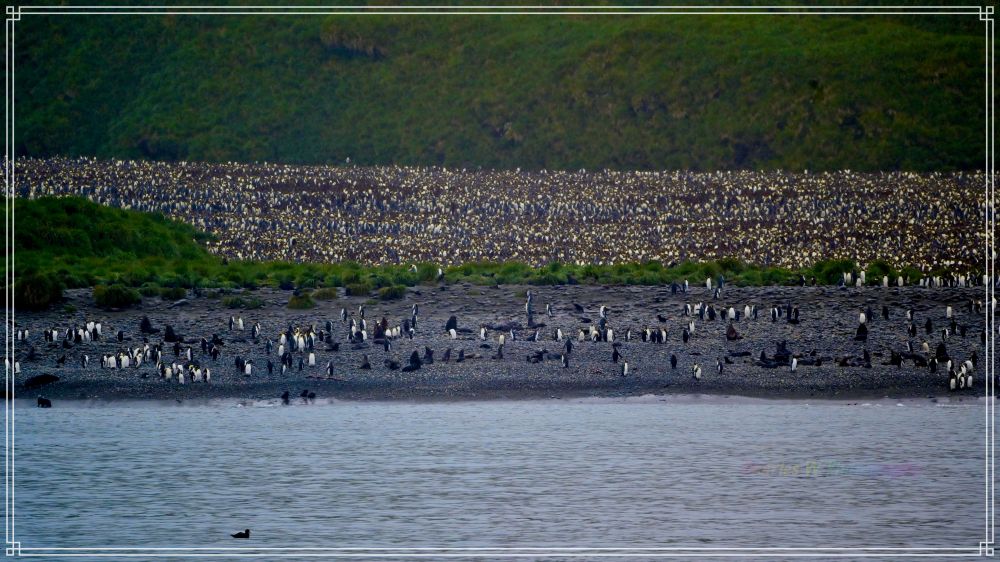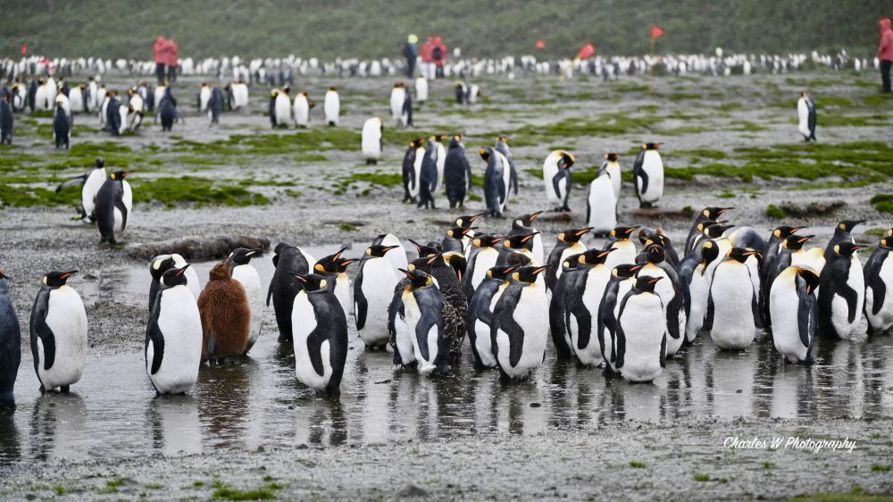 从船上已经听到企鹅此起彼伏的叫喊声了,这么大的声音只说明这里企鹅数量是很壮观的。即使在清晨的小雨和雾里,用长焦镜头还是可以看到的,这里是王企鹅(King Penguins) 栖息地,看王企鹅一定要来南乔治亚岛, 这里有45万对交配繁殖的王企鹅 (父母加小孩, 还不算不交配无小孩的王企鹅)。
