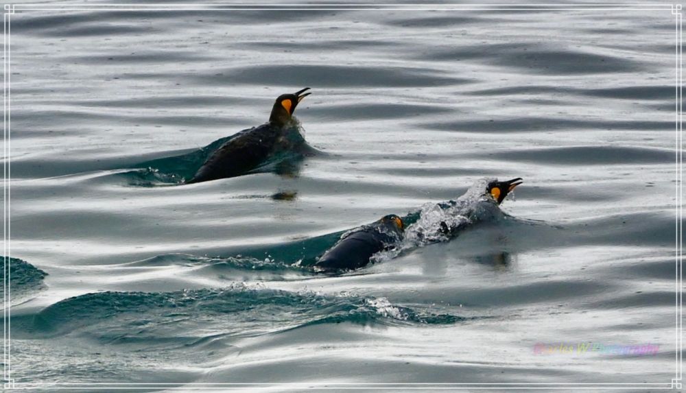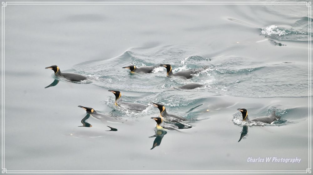 这里顺便学习并介绍一下王企鹅,它们通常体态优雅、数量庞大,在南乔治亚岛尤为常见。体型是仅次于帝企鹅的第二大企鹅,成年个体身高约 85–95 厘米。身体以黑白为主,颈部和耳侧有明显的橙黄色斑块,在灰白天空和雪地中格外醒目。羽毛致密、防水性极强,能有效抵御冰冷海水和强风细雨。