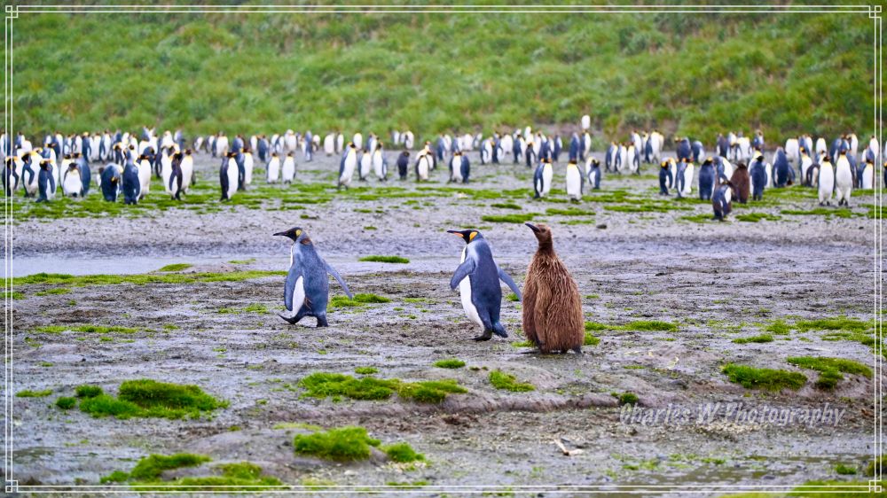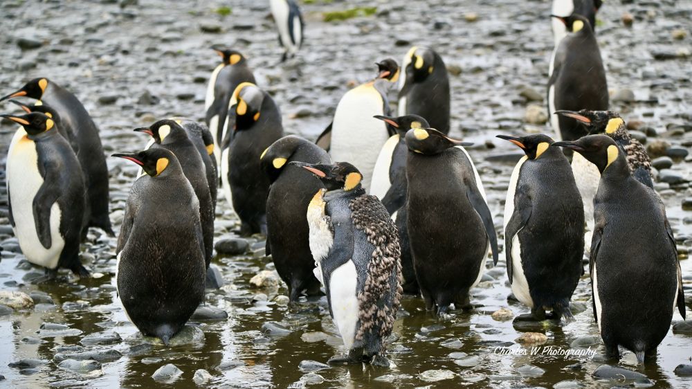 棕色羽毛的雏鸟, 部分换羽的未成年企鹅(幼年企鹅羽毛脱落并长出新羽毛这个过程叫做换羽(molting / moulting)),它们挤在成鸟之间,发出略带沙哑的叫声。雨水顺着企鹅光滑的羽毛滑落,泥泞的地面被踩得柔软,却丝毫不影响它们从容的步伐。那是一种在荒凉之地仍然生机勃勃的力量。