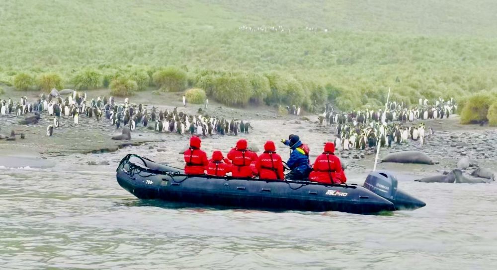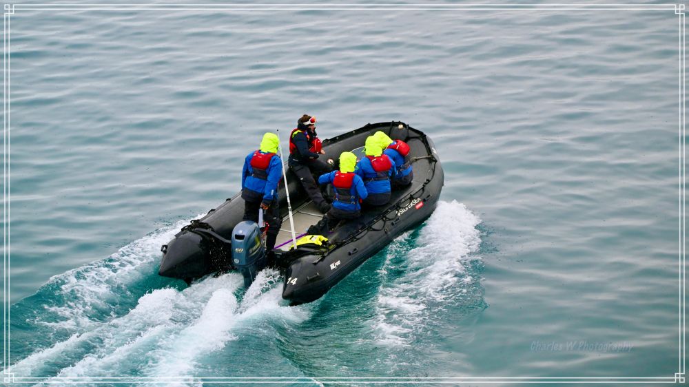 听到邮轮上的广播声中轮到我们这一组后,我们立即穿好防水衣、穿上救生衣,到三楼套上登陆靴,乘着 Zodiac 冲锋舟向岸边驶去,浪花溅起的那一刻,南乔治亚特有的冷冽气息迎面扑来。