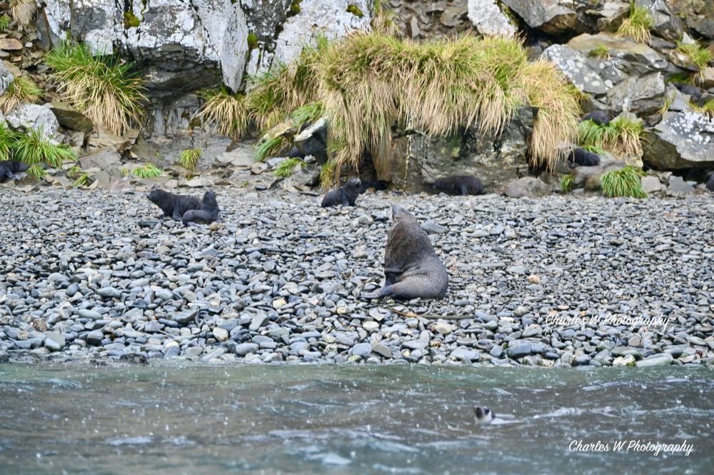 每每冲锋艇靠近岸边时,景象就逐渐热闹起来, 岸上充满着企鹅和海豹交织的尖叫声,听起来有些凄惨, 这片土地动物们的交响乐似乎无处不在。岩石与卵石滩上,企鹅成群结队地站着,有的低头整理羽毛,有的迎着风雨一动不动,像一排黑白分明的剪影。它们偶尔会突然滑入水中,溅起一圈白色水花,又迅速消失在灰暗的浪影里。
