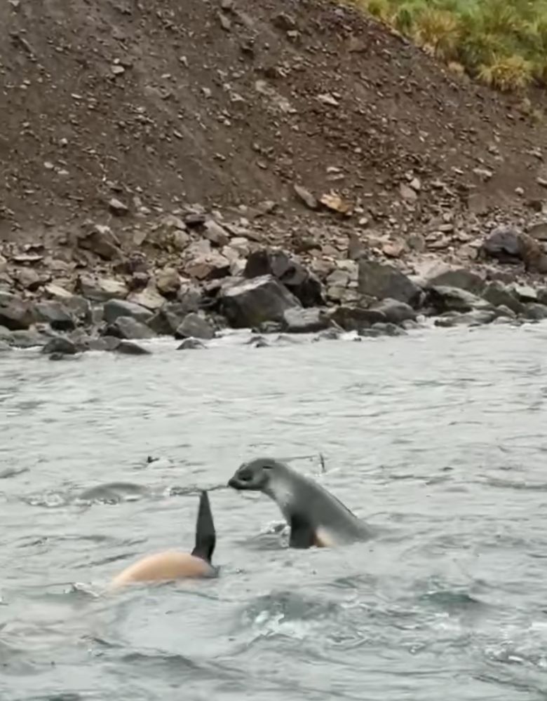 海豹则显得自在得多。岸上的海豹或卧或躺,湿漉漉的身体在雨中泛着暗淡的光泽,偶尔抬头看我们一眼,随即又懒洋洋地闭上眼睛。 偶尔为地盘而打斗。水里的海豹则完全是另一种姿态——它们贴着 Zodiac 游动,身体灵活而流畅,在浪中翻滚、潜入、再冒出水面,像是在审视这群闯入者,又像是在玩一场即兴的游戏 或者是兴风作浪,或者是人来疯。