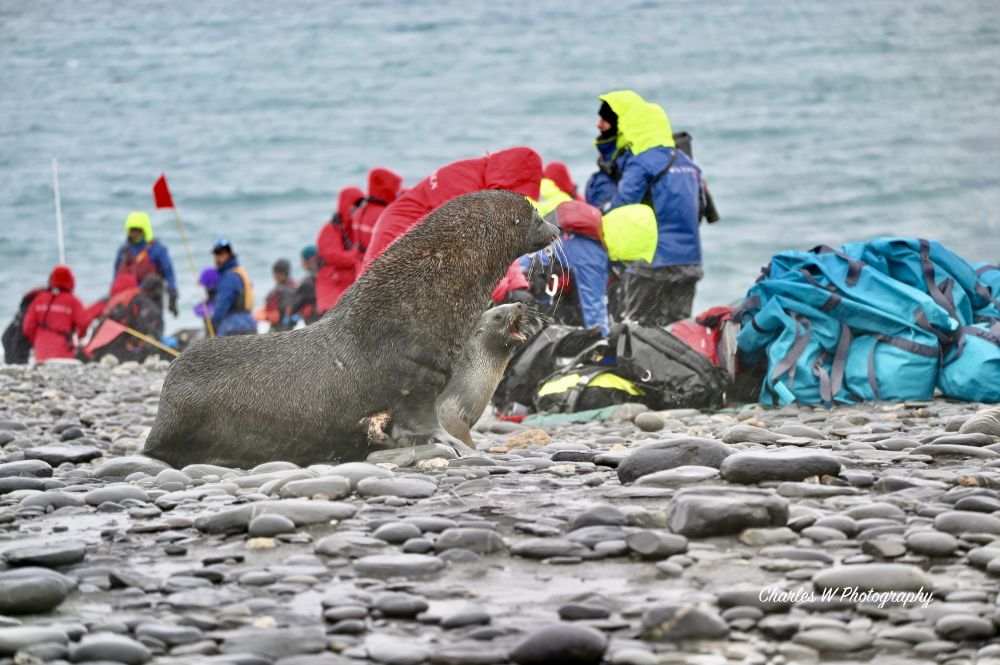 象海豹蠕动着前行,皮毛海豹跳跃着前行,我们之前被告知,如果海豹冲着人来(特别是有幼崽的),双手要高高举起,通常海豹会停止进一步前行。其实我们队伍中已碰见过好几次海豹冲着人来。