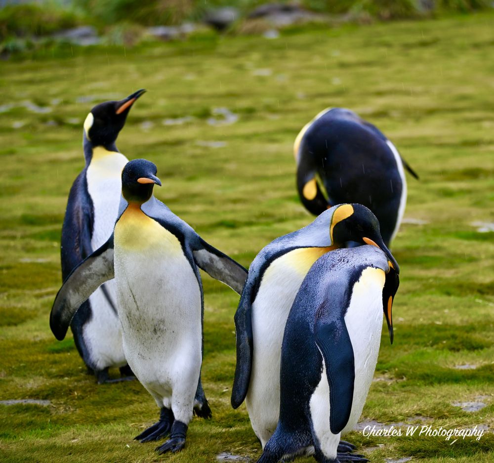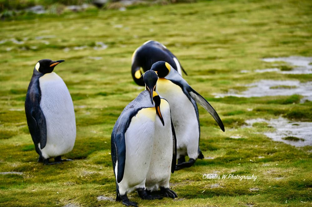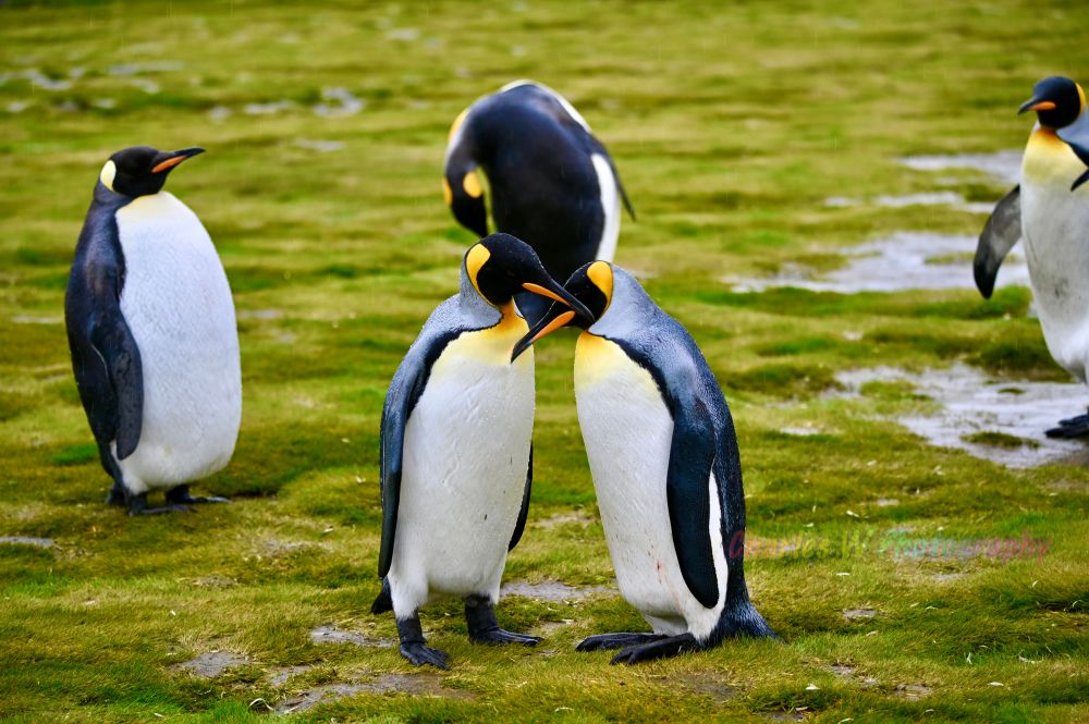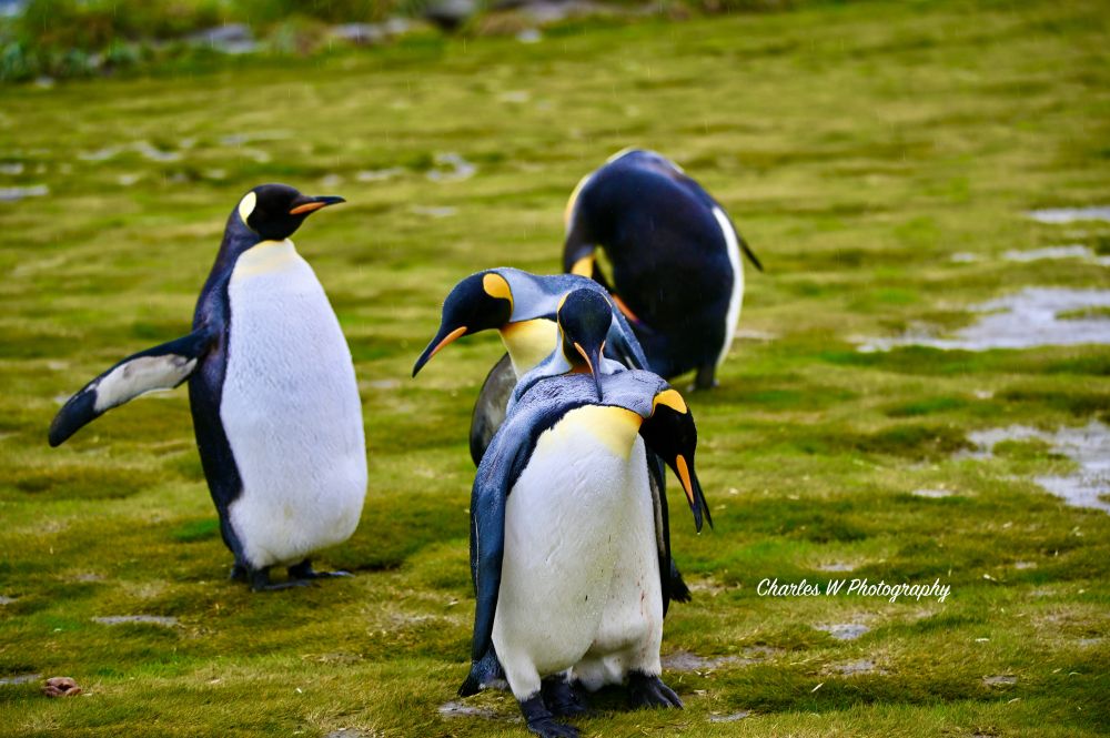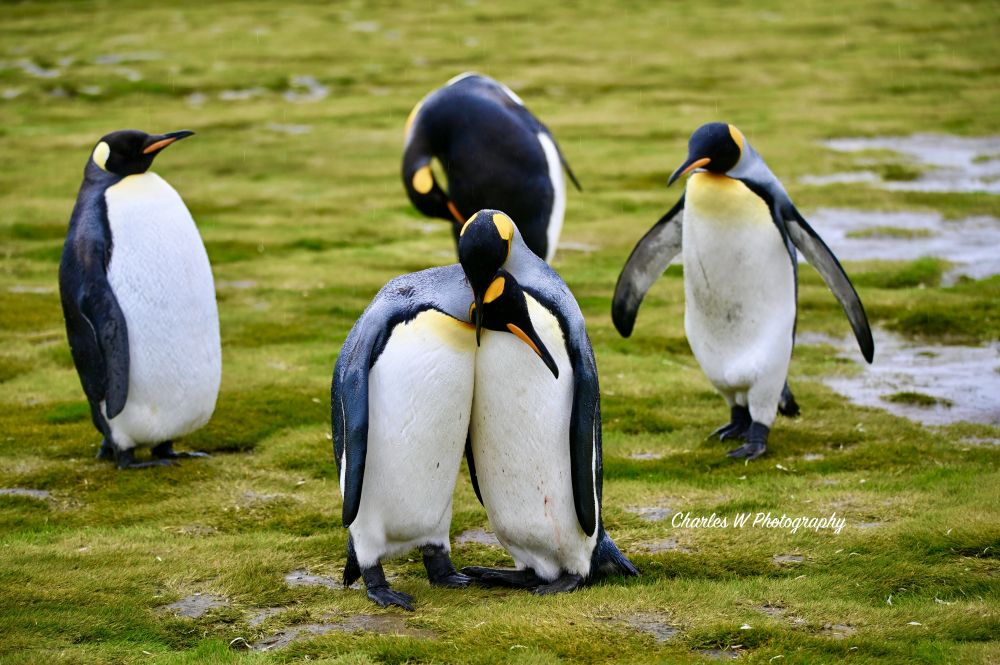 这儿也调侃一下我拍到的企鹅花絮。下面照片上五只王企鹅, 两只在秀恩爱(前),一只在淡定从容地观看热闹(左),一只完全不在乎(中后),但是还有一只在吃醋(右)。