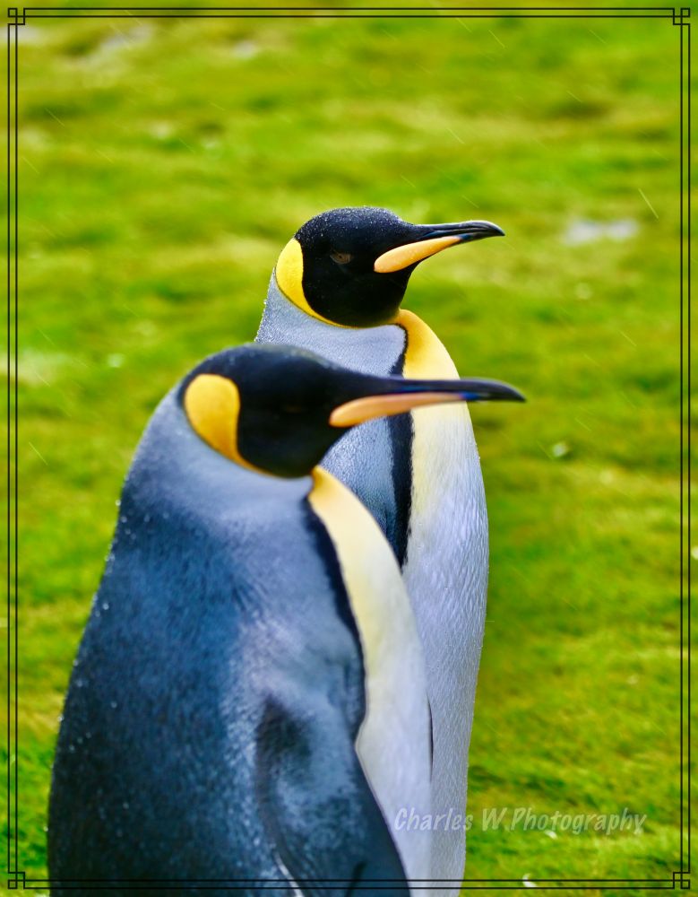 眼前是成千上万只王企鹅密密麻麻地铺展开来,黑白与橙黄在阴雨中依然鲜亮。它们或昂首站立,或低头整理羽毛。