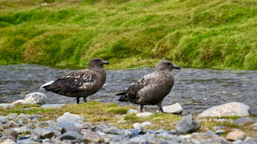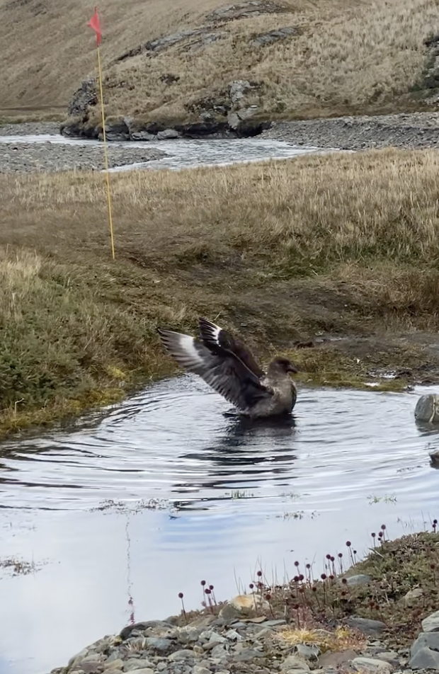 途中,贼鸥在地上站着,像是在晾晒,也像是在警惕猎物。