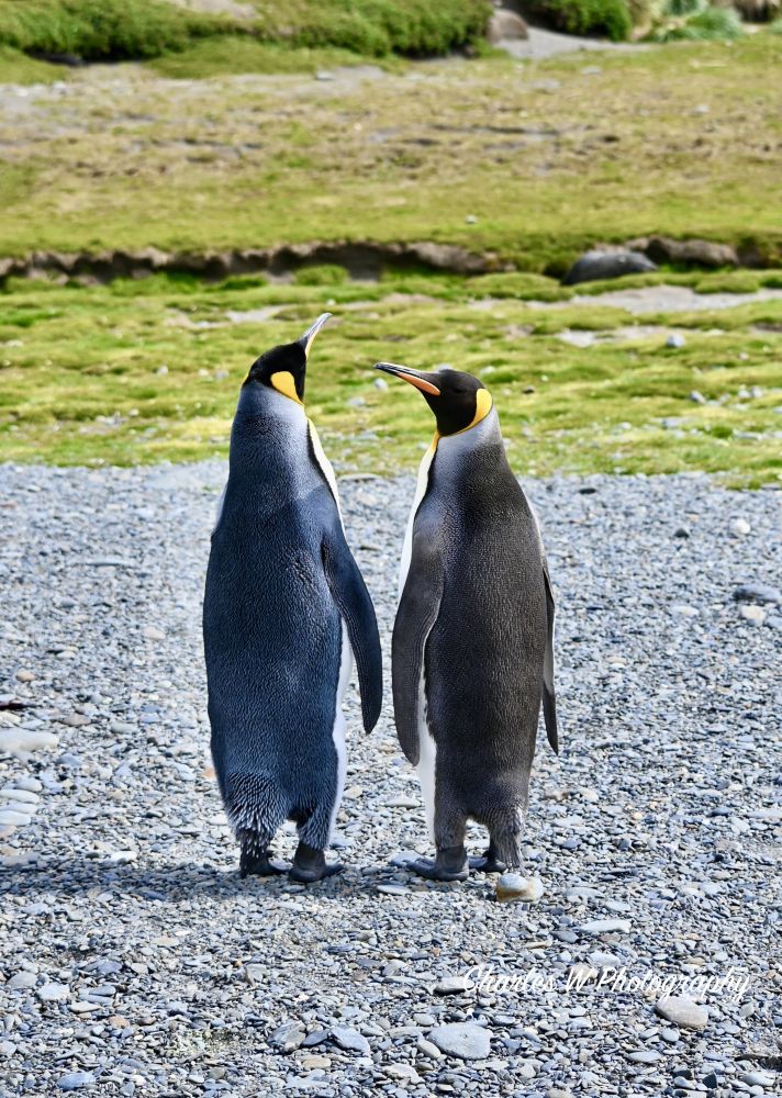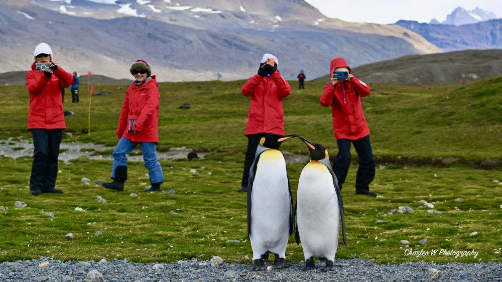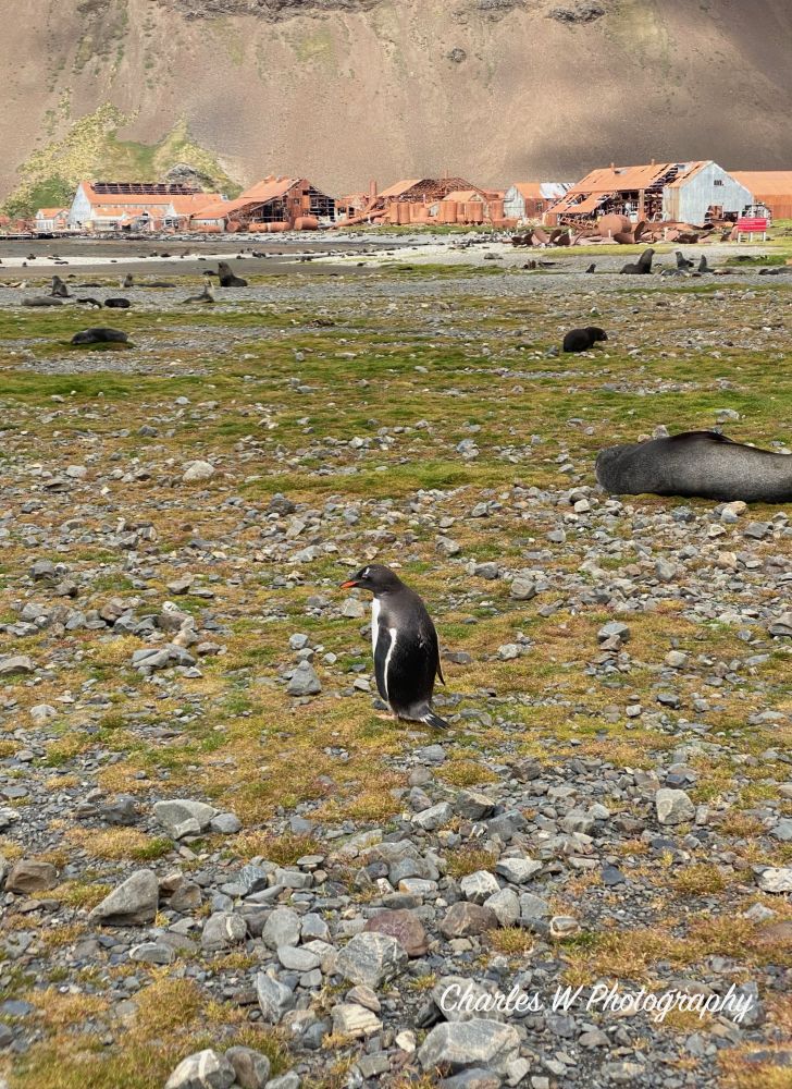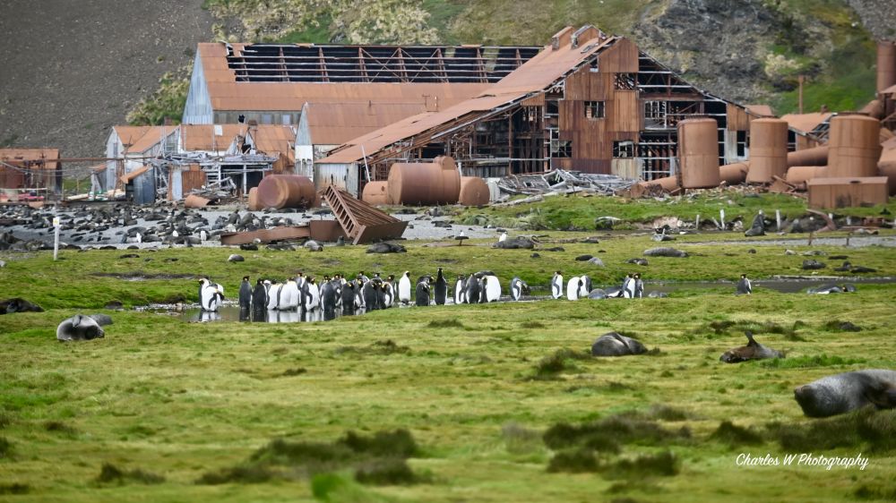 企鹅偶尔出现,站在风中,一动不动,仿佛比人类更懂得如何在这片土地上生存。多数是王企鹅,看到一只金图企鹅望着昔日的捕鲸站。