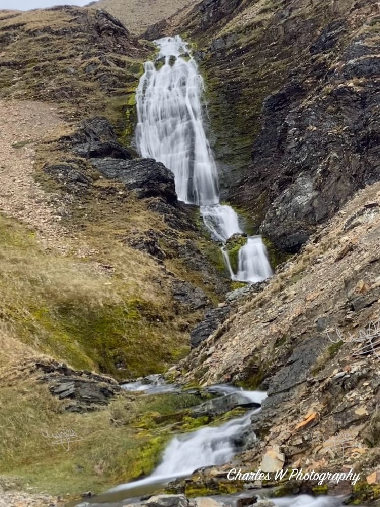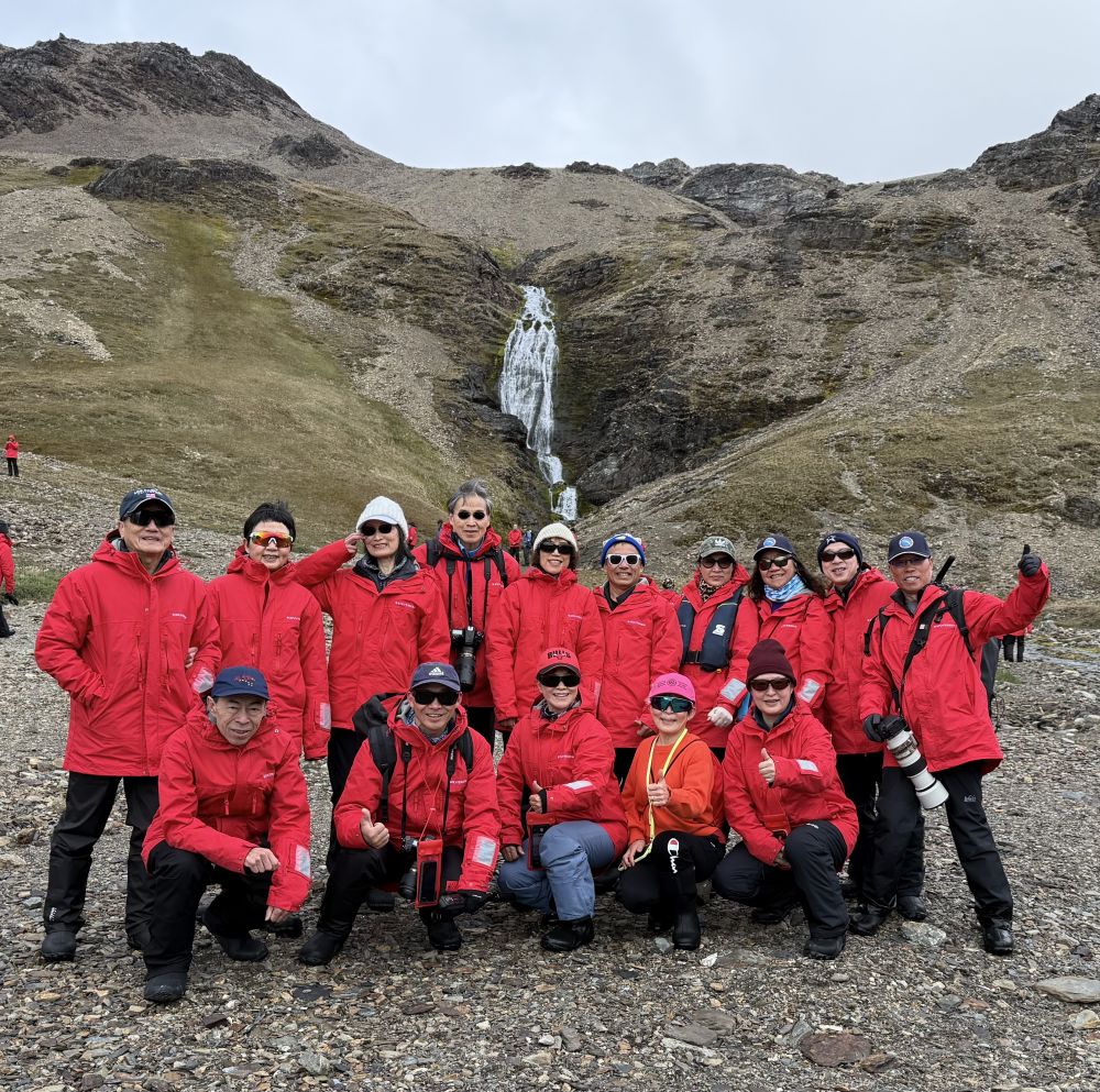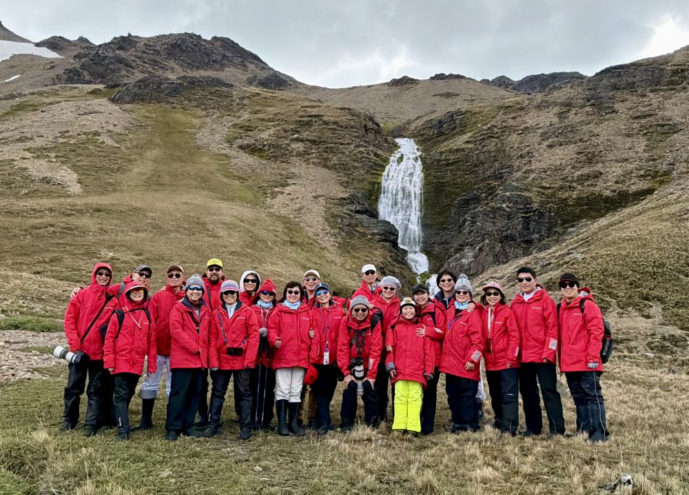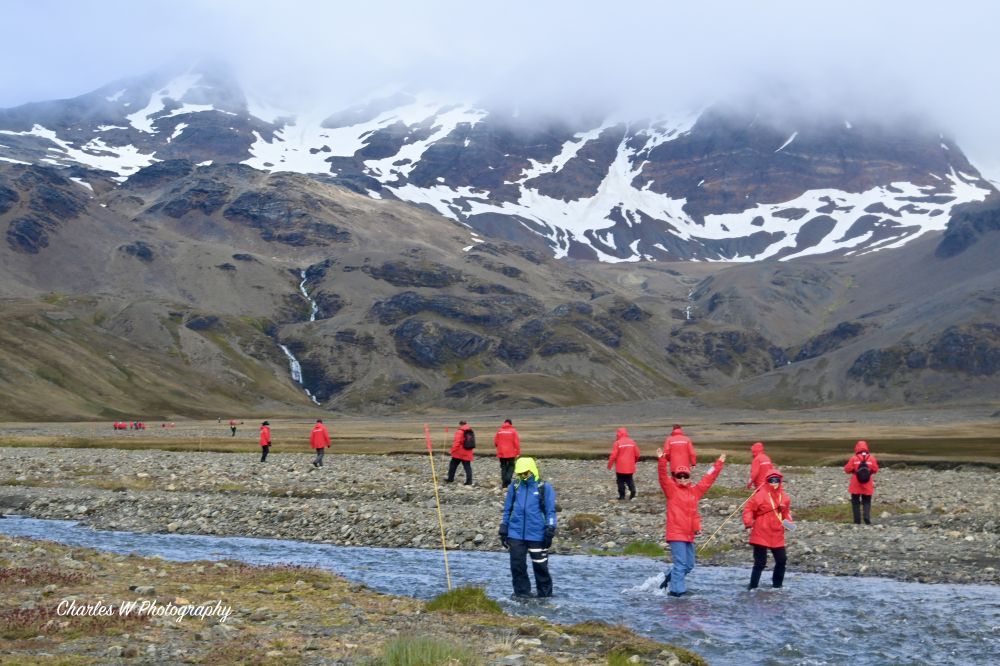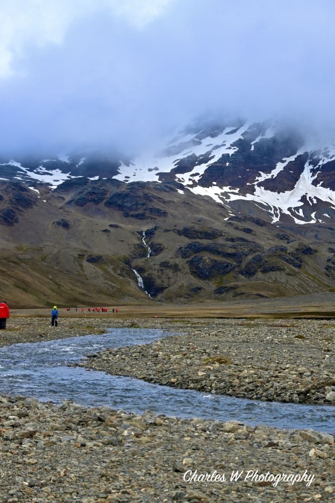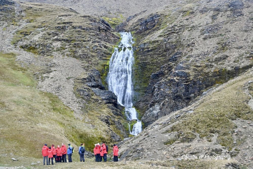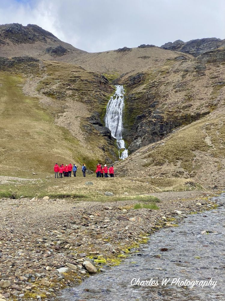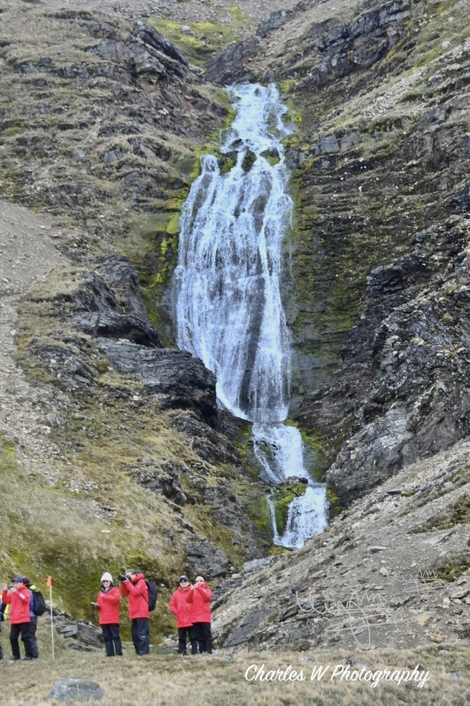 沿着碎石、草甸与湿滑坡地前行,有时要穿过小溪流,原生态的地方,桥是没有的。我们的目标很明确——Shackleton Falls。走着走着,Shackleton Falls就在视野里出现了,瀑布前来自美国的探险队员Zak已在向大家讲解这段历史,他讲起故事来口若悬河,滔滔不绝。