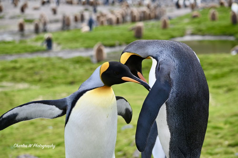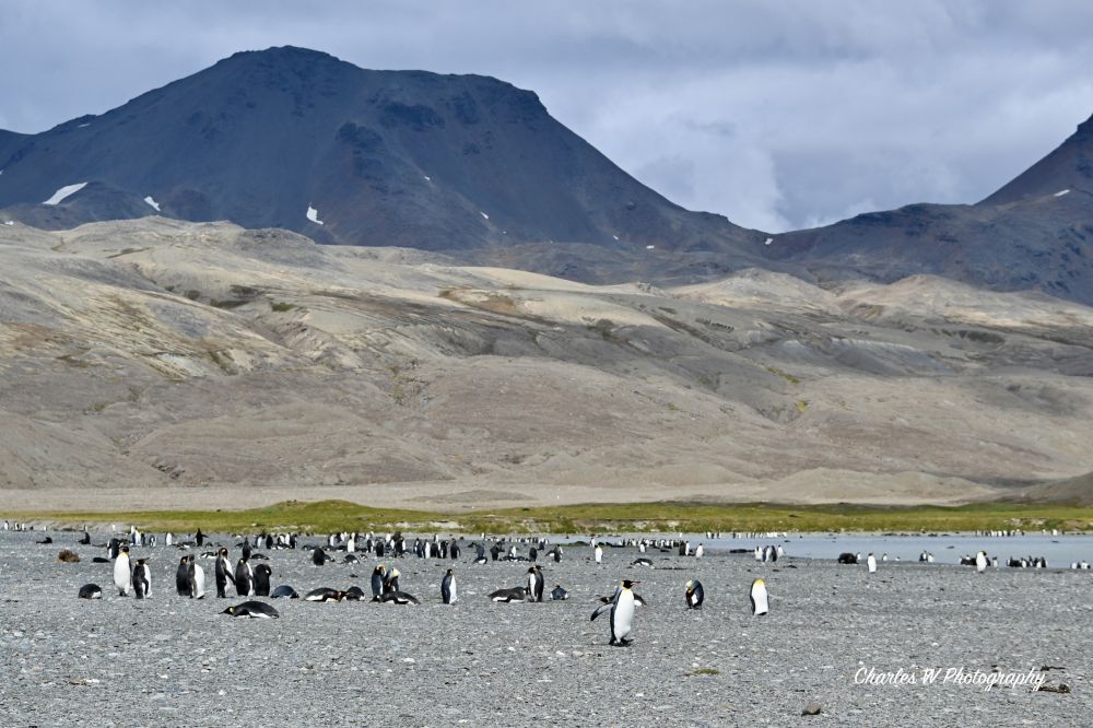 穿过滩头密集的“海豹阵”,我们向着海湾深处的王企鹅栖息地进发。这里约有20,000对王企鹅定居。它们“穿着整齐”,颈部那一抹明艳的橘黄色在灰色的苔原背景下和极地阳光照耀中显得格外耀眼。