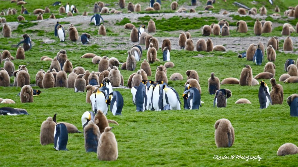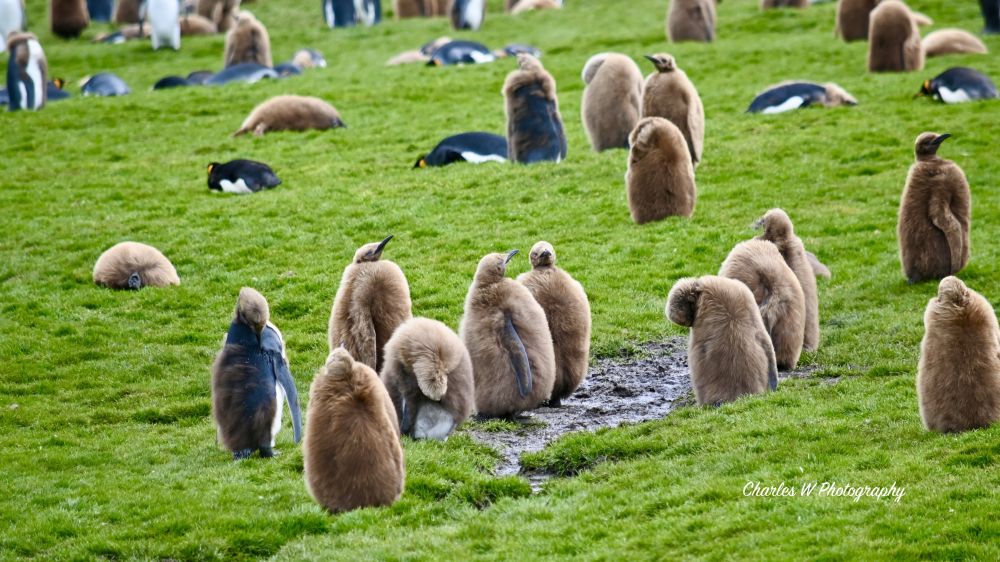 这里的企鹅群里有数不清的王企鹅宝宝,有刚出生不久披着棕色羽毛的,有半换羽毛的,憨态可掬。此时正值幼鸟的换毛期,成群的小企鹅(因全身棕色羽毛被昵称为“橡木桶”)挤在一起。它们看起来既笨拙又可爱,偶尔会有几只好奇的小家伙摇摇摆摆地向你走来,在距离你几米远的地方停下,双翅尽力地摇摆着,歪着头打量这些穿着红色冲锋衣的“异类”。