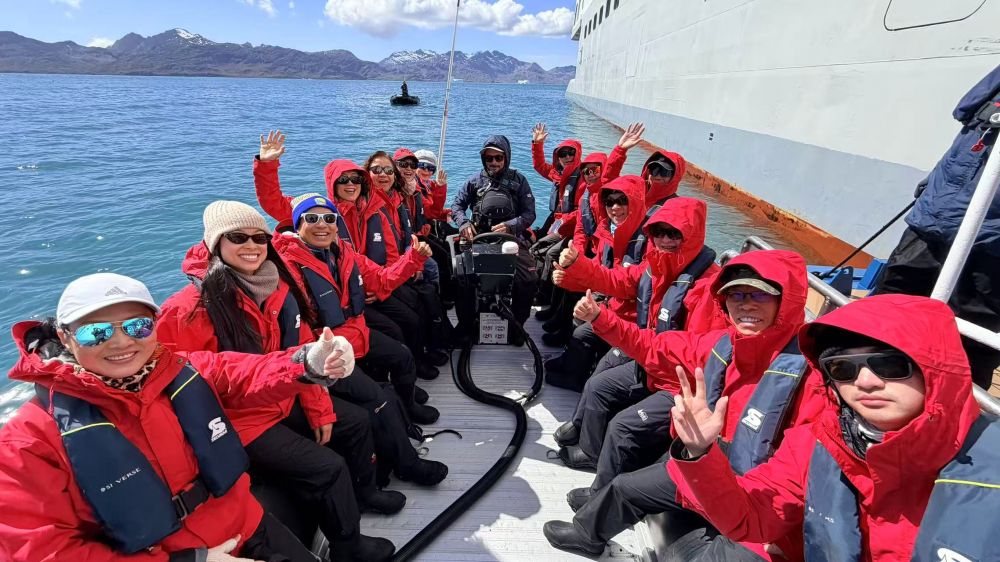 当我们的冲锋舟缓缓驶入福图纳湾时,天空呈现出一种深沉的铅灰色,海面上漂浮着像人头样的冰山。这片海湾以探险家安东·拉森的捕鲸船“福图纳号”命名,三面被陡峭的雪山环抱,远处的柯尼希冰川(Konig Glacier)正静默地向海边推进。