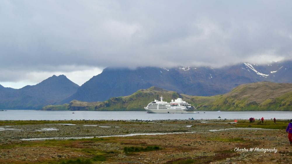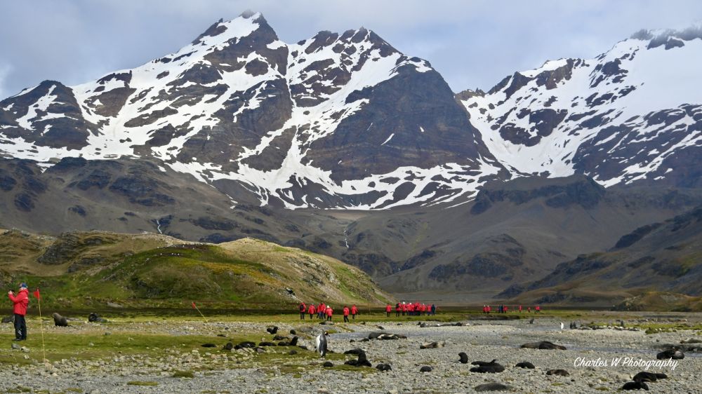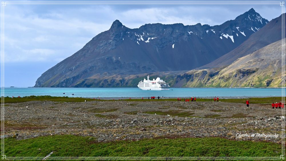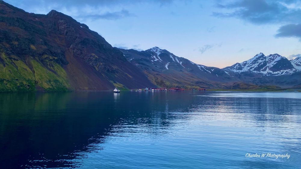 清晨的Stromness Bay 风景如画,雪山秀丽,海面清澈, 倒影轮廓清晰。站在游轮上可听见远处企鹅和海豹的叫喊声。
