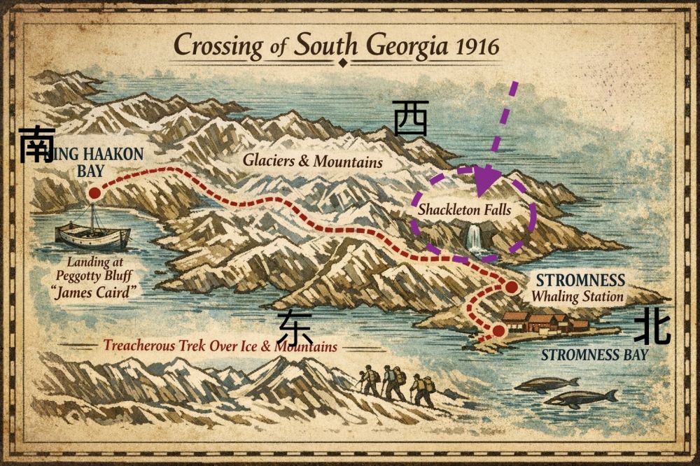 他们首先向北攀登至内陆高地,逐渐远离海岸,那里的地形是高山山脉与冰雪坡段,很多地方毫无路径可循。再穿过如今称为 Shackleton Gap 的山口,这是跨越 Allardyce 山脉的关键路线。中途又经过冰原、陡峭的山脊以及难行的坡段。天气极端,海拔不断变化,山上厚积雪、冰原及危险的岩石非常考验体力与导航技能,因为没有帐篷,他们几乎不停地行进,以避免体温过低。其中有三次还转错了弯,凭借星象和直觉得到了修正。一段艰难攀爬后,他们先到达 Fortuna Bay 附近,但发现它没人居住。于是重新爬山,跨越最后一段山梁。这段路线上还有如今称为 Crean Lake 的小湖,克里恩曾一度掉进湖水中,但继续前行。爬过最后一山脊后,他们沿着如今称做 沙克尔顿瀑布(Shackleton Falls) 的河谷下坡。这段路最终通向 Shackleton Valley, 这就是今天我们要走的路。当他们在暴风雪和极度疲惫中,听到瀑布流水声时,意识到——这条瀑布,是他们从“必死之地”走回人间的最后一步。