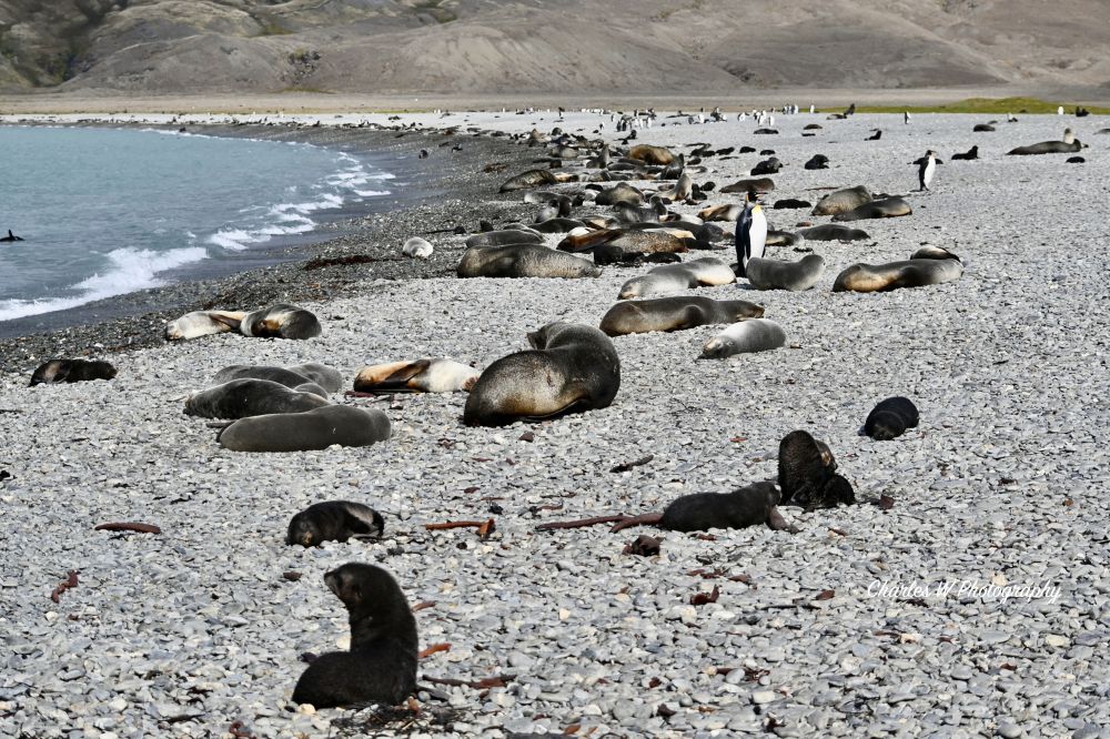 一会儿冲锋舟在 Stromness Bay 靠岸,这里的海面比外海平静得多,像一口收住了风浪的海湾。碎石滩、旧捕鲸站遗址、低矮的山坡依次展开, 一些王企鹅和海豹懒懒散散的躺着或站着——一切看起来都出乎意料地“正常”。