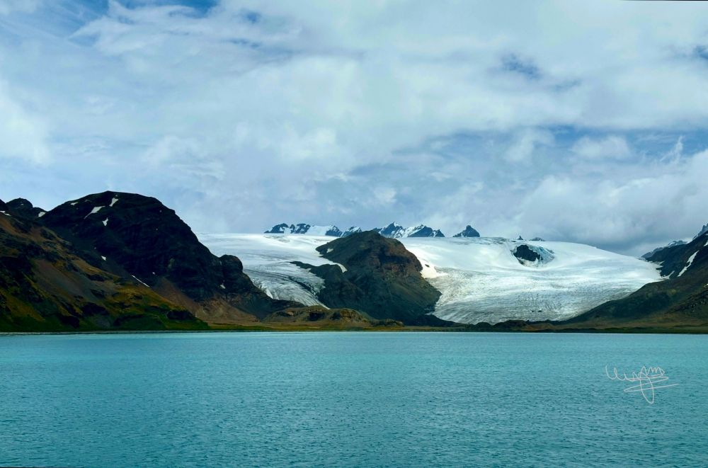 傍晚离岸时,回头看一眼,今天沙克尔顿瀑布在山的另一侧,王企鹅栖息地在这一侧湾内,彼此并不相见,却共享同一座岛。