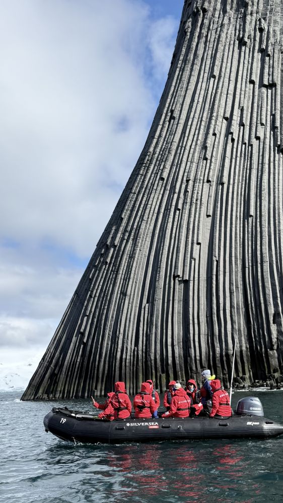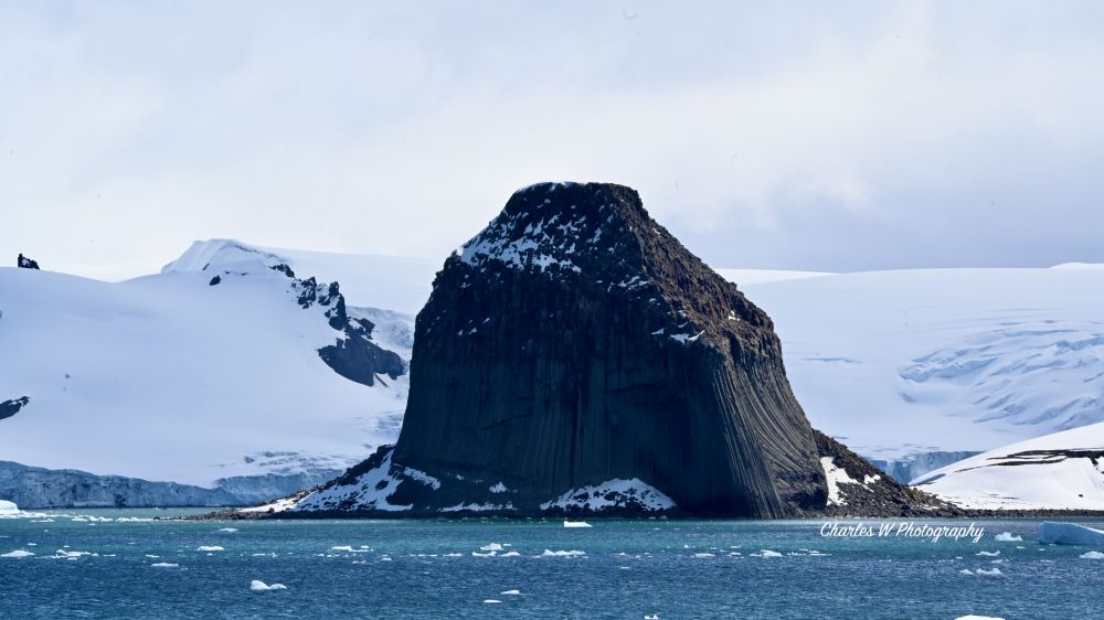 爱丁堡山是“岛上的山峰”,但它看起来像是在“水上的突出部”。从地理定义上讲,爱丁堡山位于利文斯顿岛(Livingston Island)的瓦尔纳半岛东岸。它并不是一个完全孤立在海中的小岛,而是通过一段狭窄的陆地连接在主岛上。可以把它想象成伸入海中的一个角(Point)或岬角。虽然它连着岛,但乘坐游轮或冲锋舟从麦克法兰海峡(McFarlane Strait)经过,你的视觉感受会是它“矗立在水上”:它的三面被海水包围。它的底部一半以上都是直插海底的垂直柱状玄武岩,没有缓和的沙滩过渡,看起来就像一根巨大的石柱直接从深蓝色的南大洋中升起。